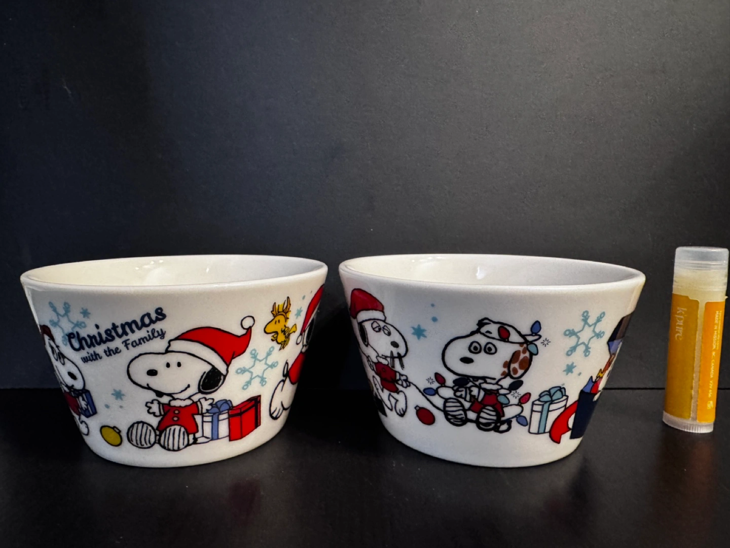 Adorable set of two ceramic bowls. Featuring Snoopy characters celebrating Christmas.