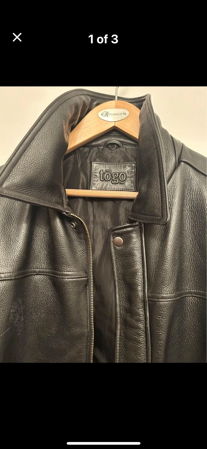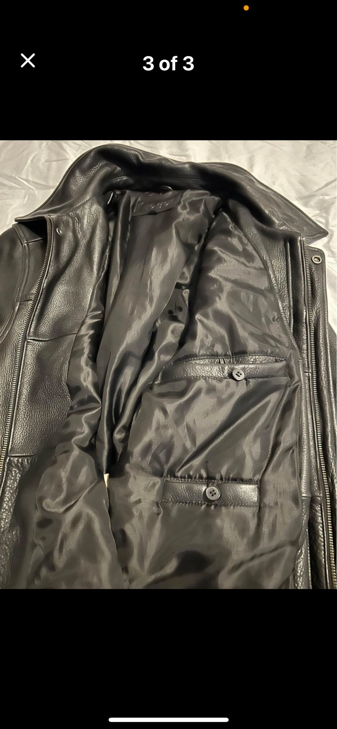 Black genuine leather jacket. Features a zip-up front and multiple pockets. Classic style. Never worn. Excellent condition.