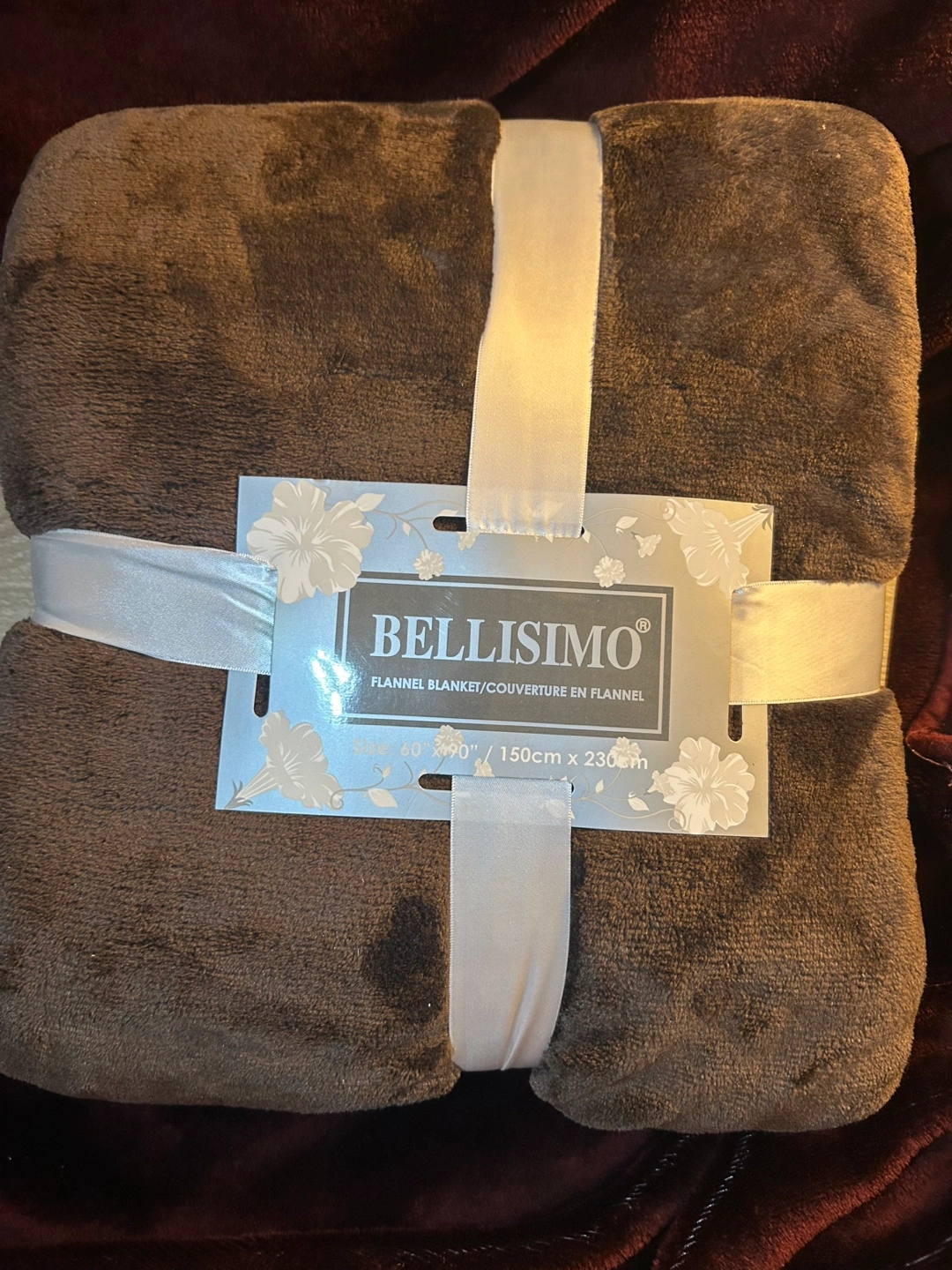 Soft and cozy flannel blanket. Dark brown colour. Measures 60" x 80" (150cm x 230cm). Perfect for snuggling up on the couch.