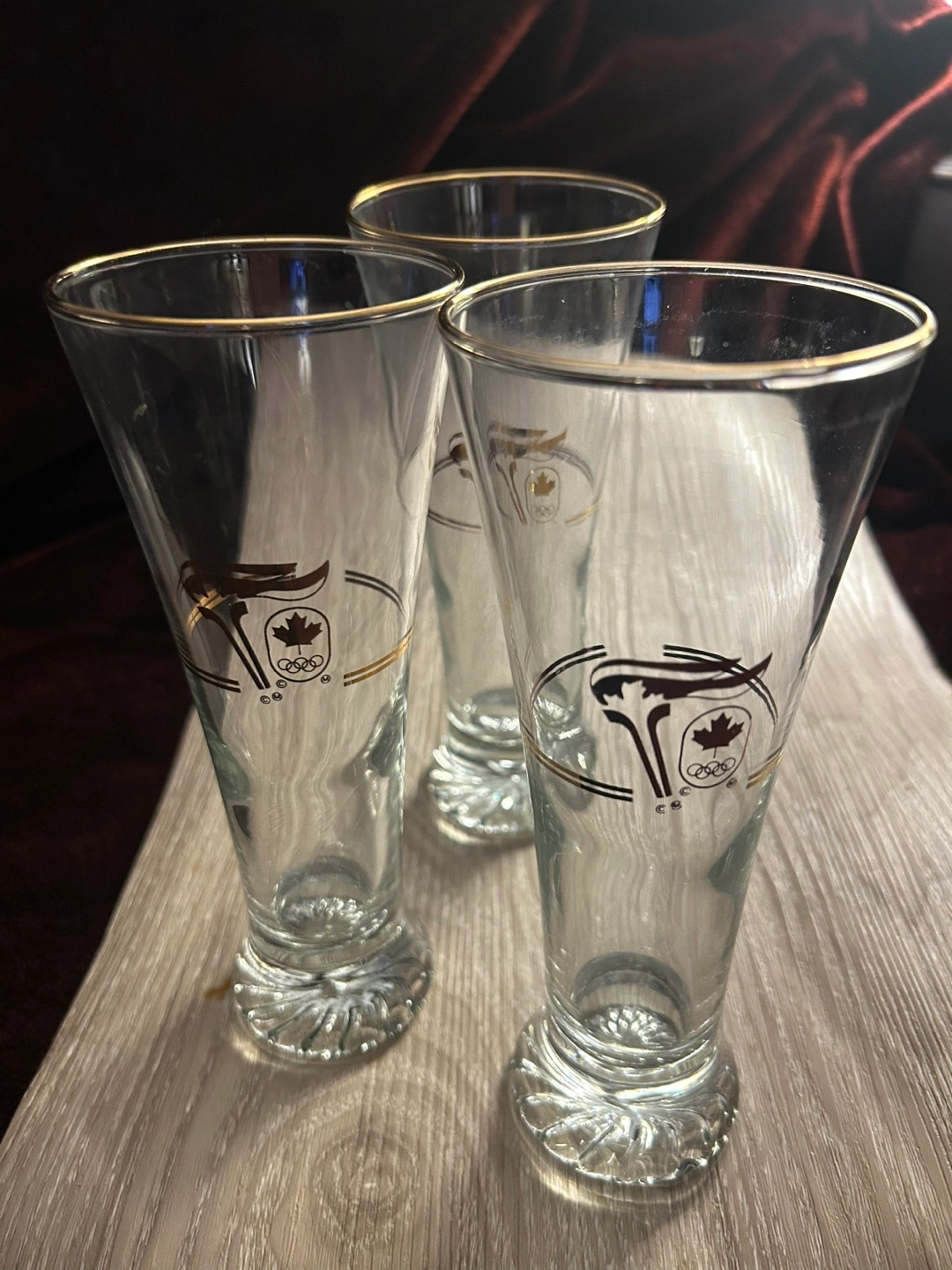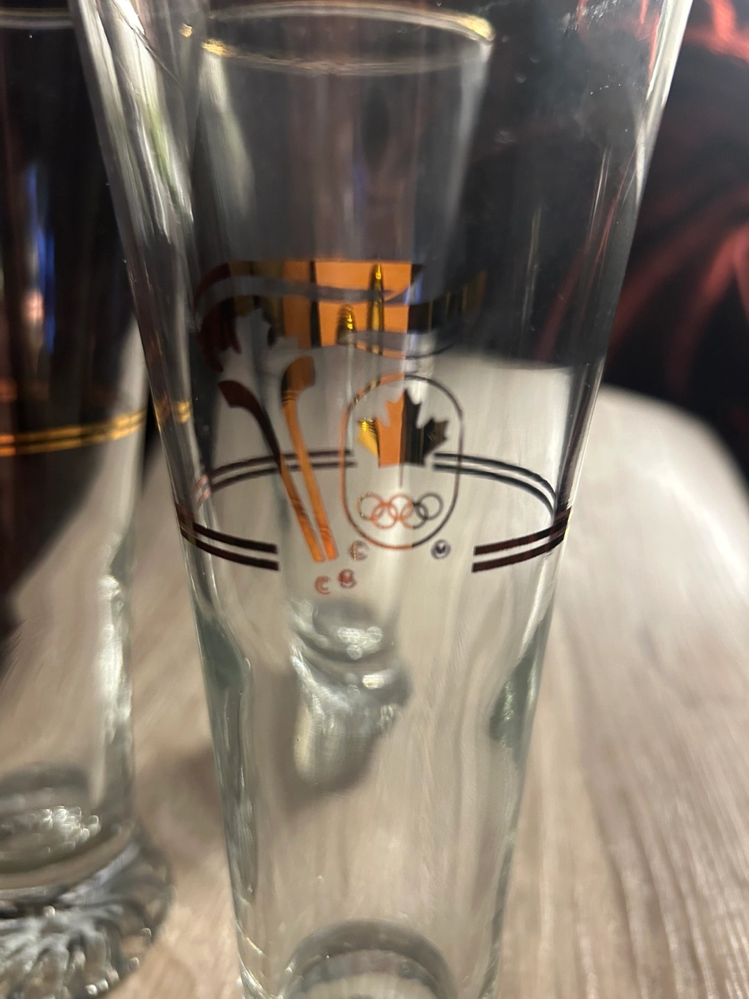 Set of three vintage glasses. Commemorative design. Features the Calgary 1988 Olympic logo. Clear glass with gold accents. Great for collectors. Each $10 or $8 each for two or more.