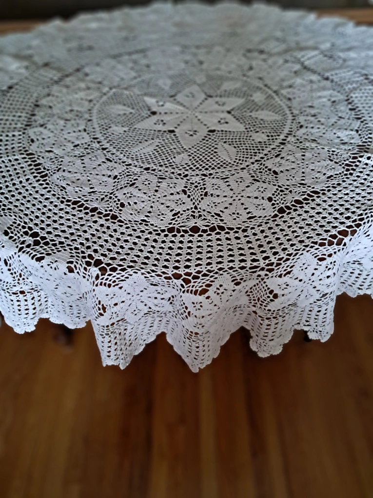 1000+Beautiful vintage crocheted tablecloth. Intricate design. Lovely for special occasions or everyday use. Measures approximately 50 inches in diameter. Unique piece for your home.