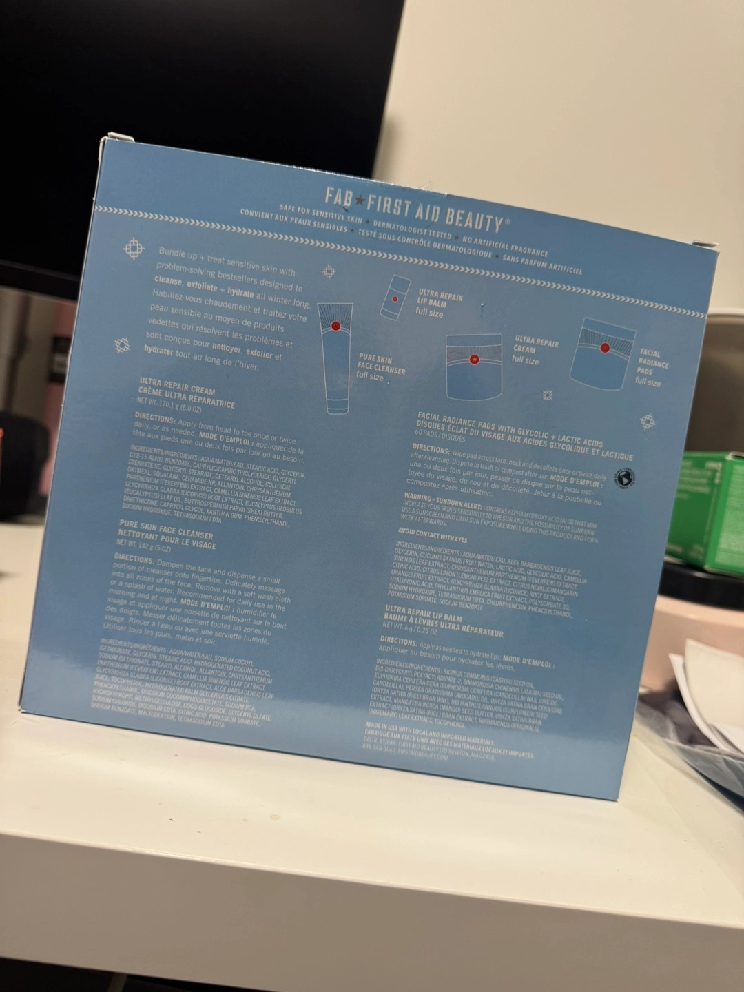 New, sealed FAB First Aid Beauty hydrate bundle. Includes full-size Pure Skin Face Cleanser, Facial Radiance Pads, and Ultra Repair Cream. Perfect for hydrating your skin.