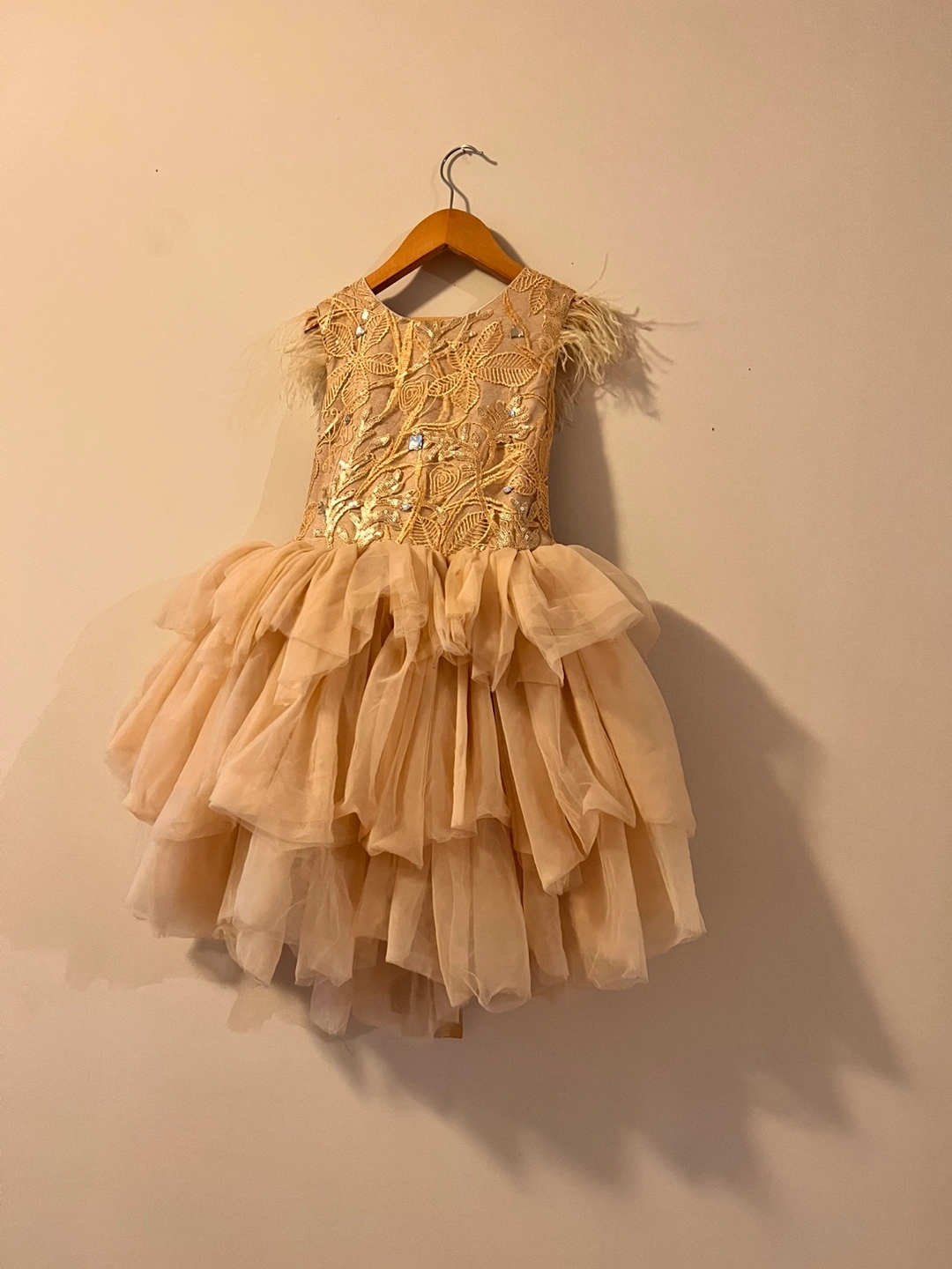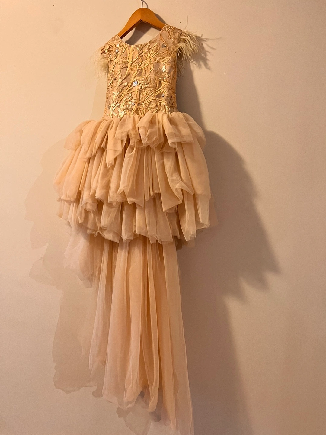Gorgeous champagne gold tulle dress. Features a high-low hemline, multiple tulle layers, gold embroidery, and feather shoulder accents. Back zipper and ribbon detail. Perfect for a special occasion.