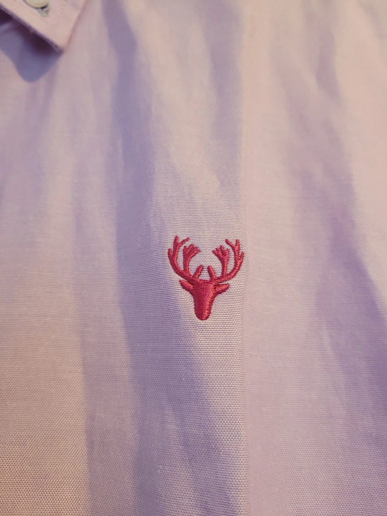 Men's lavender short sleeve shirt. Size XL. Features a pink deer logo and colourful inner cuffs. Premium craftsmanship from Cambridge, Great Britain.