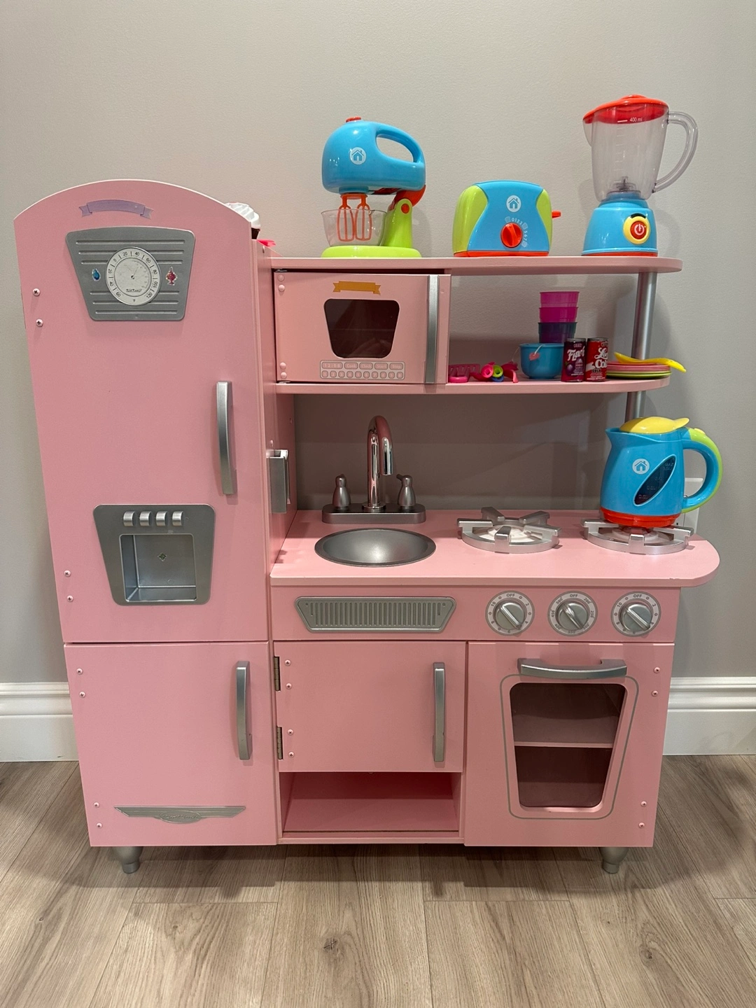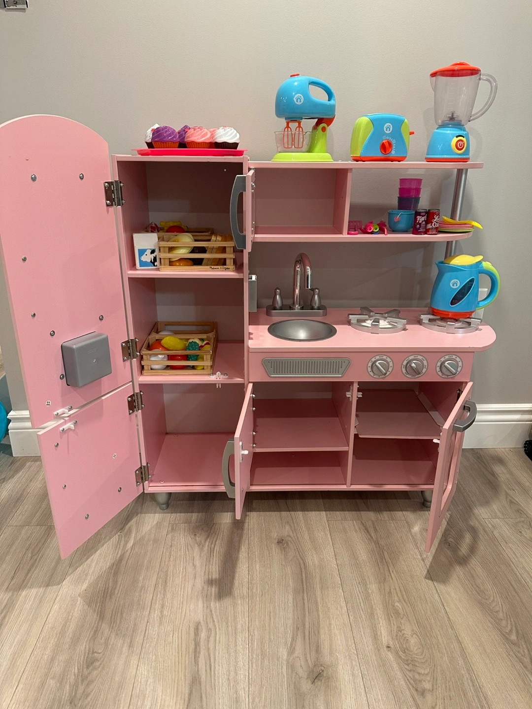 Adorable pink wooden play kitchen. Includes pretend appliances: mixer, toaster, blender, kettle. Features shelves, sink, stovetop, and fridge. Some pretend food and utensils included. Great for imaginative play.