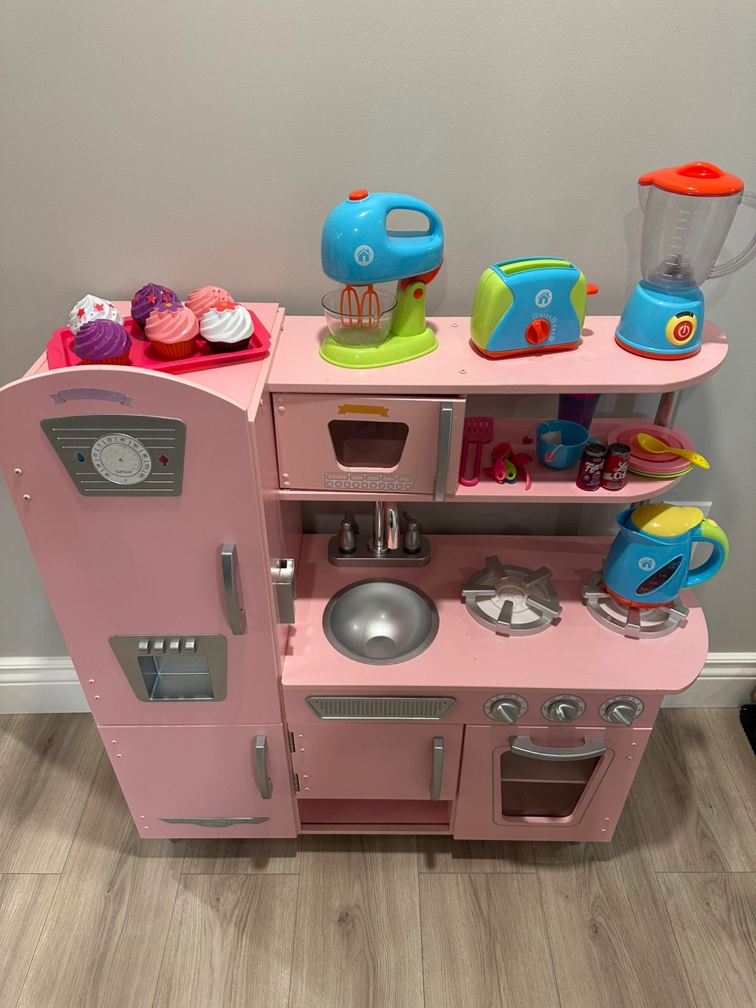 Adorable pink wooden play kitchen. Includes pretend appliances: mixer, toaster, blender, kettle. Features shelves, sink, stovetop, and fridge. Some pretend food and utensils included. Great for imaginative play.