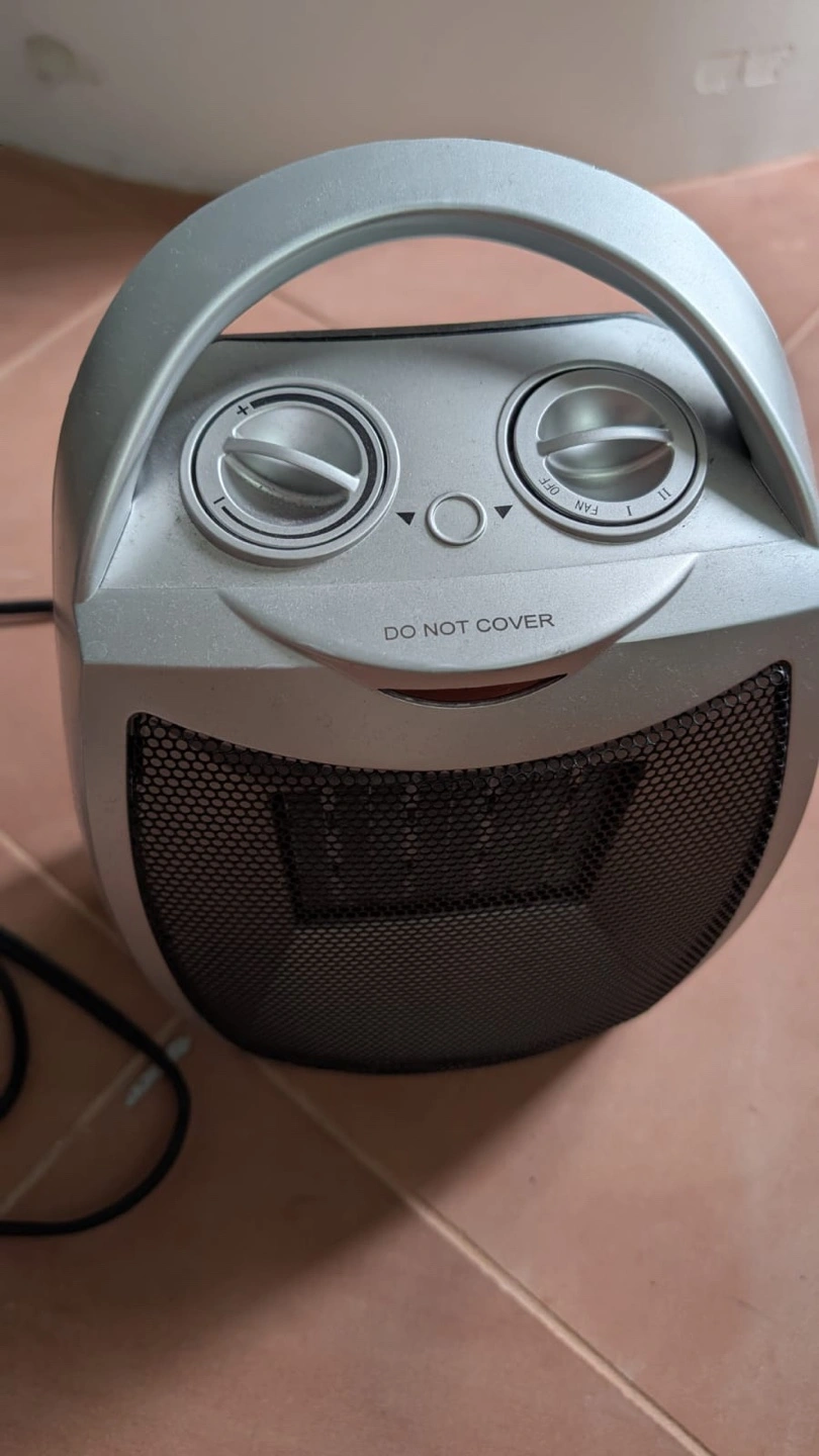Compact personal heater. Features two heat settings and an adjustable thermostat. Convenient carrying handle. Silver colour.