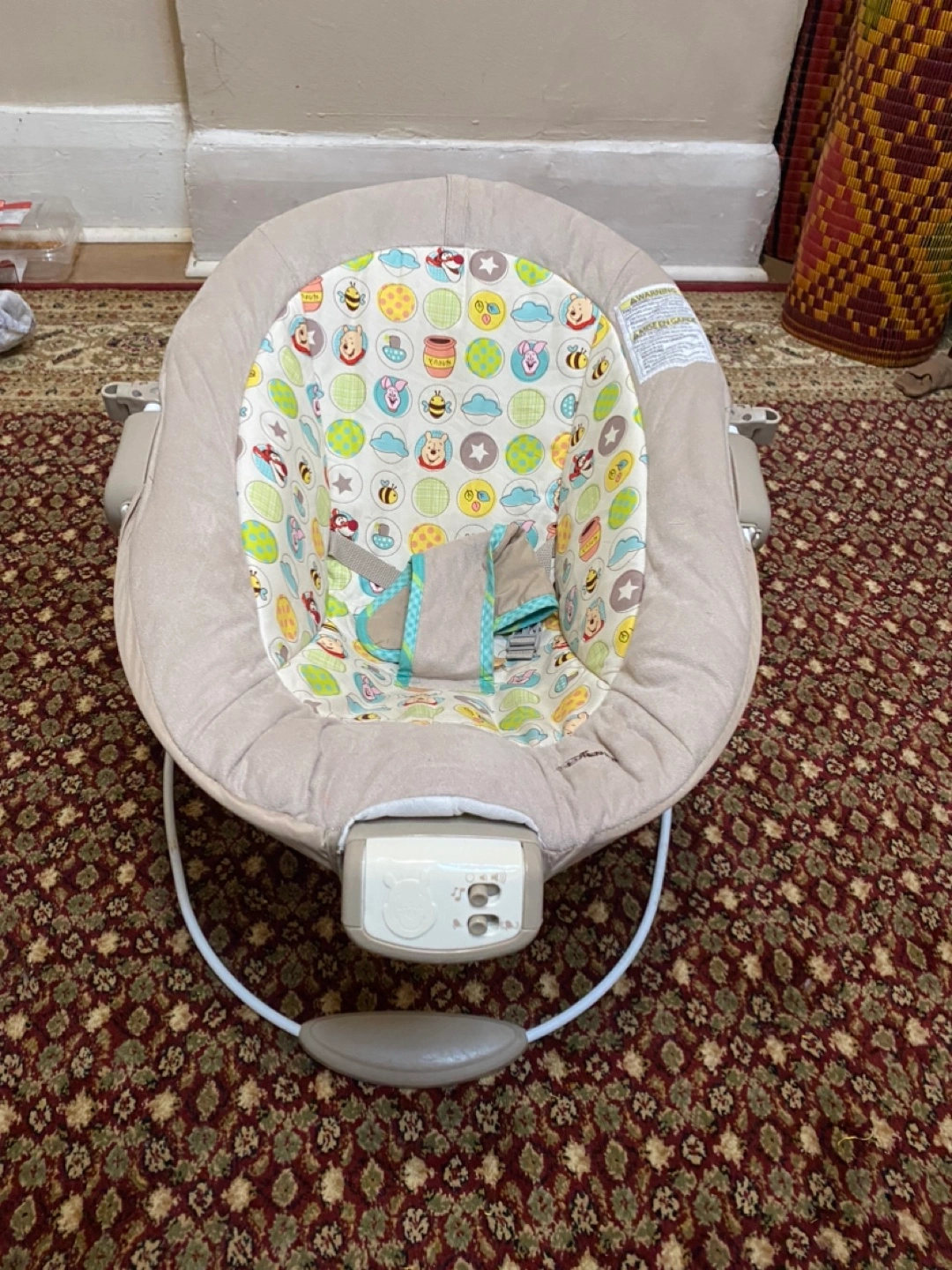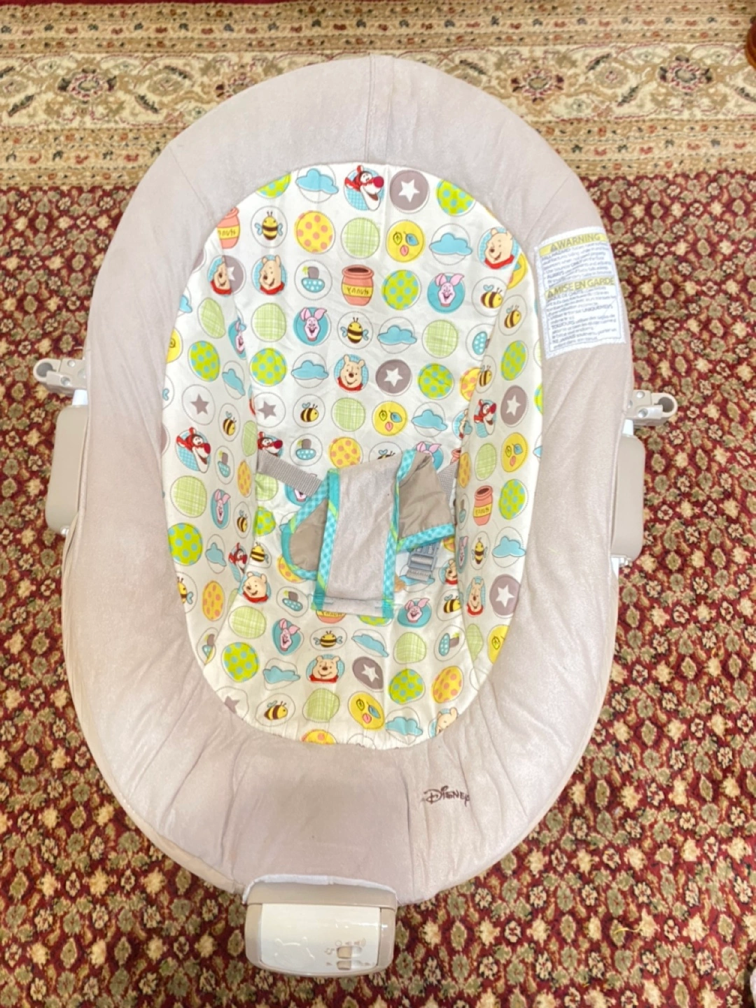 Adorable baby bouncer featuring Winnie the Pooh and friends. Features vibration and multiple recline positions. Gently used, excellent condition.