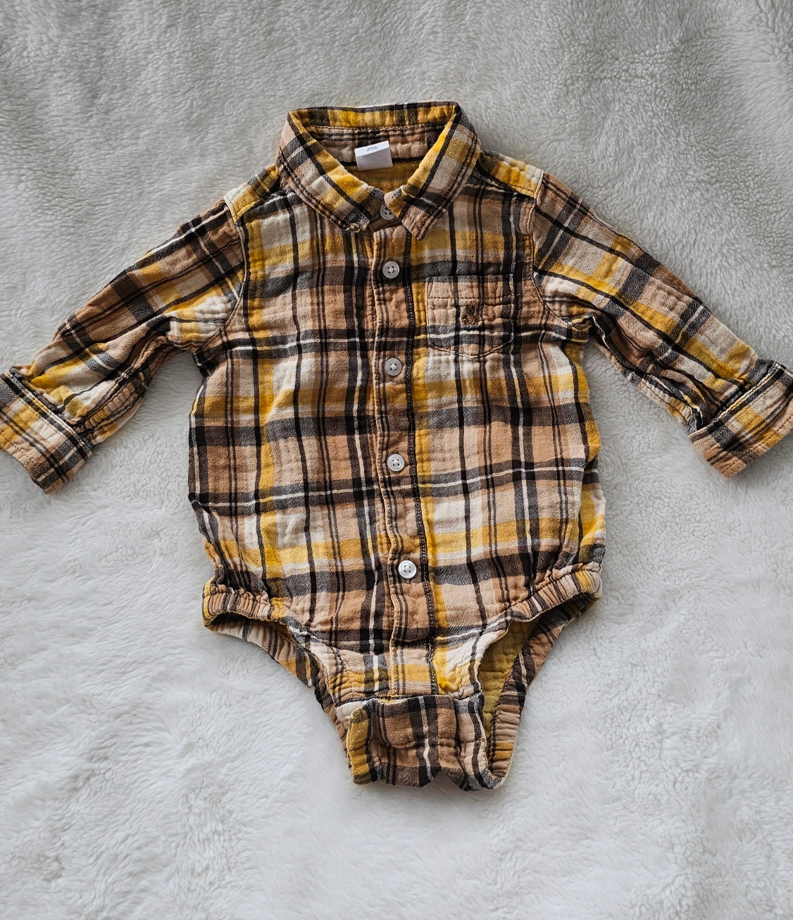 153Adorable baby boy's bodysuit. Long sleeves, button closure, and a chest pocket. Plaid pattern in yellow, brown and black. Great for fall or layering. 6-12 months Pickup in Midtown SW, Airdrie
