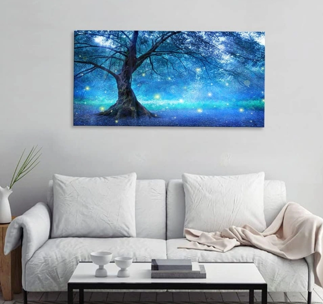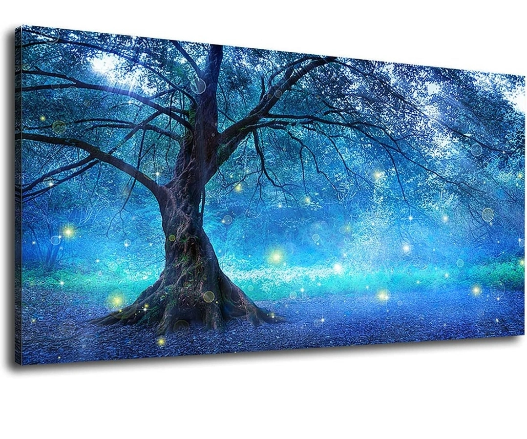 Stunning panoramic canvas print. Features a large tree in a mystical forest. Perfect for adding a touch of magic to your home décor. Ready to hang. 50 cm by 100 cm