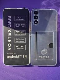 Vortex CB68 Android smartphone. 6.7 inch HD display. Triple rear camera. Octa-core CPU. 3300 mAh battery. Slim design. Integrated wallet.