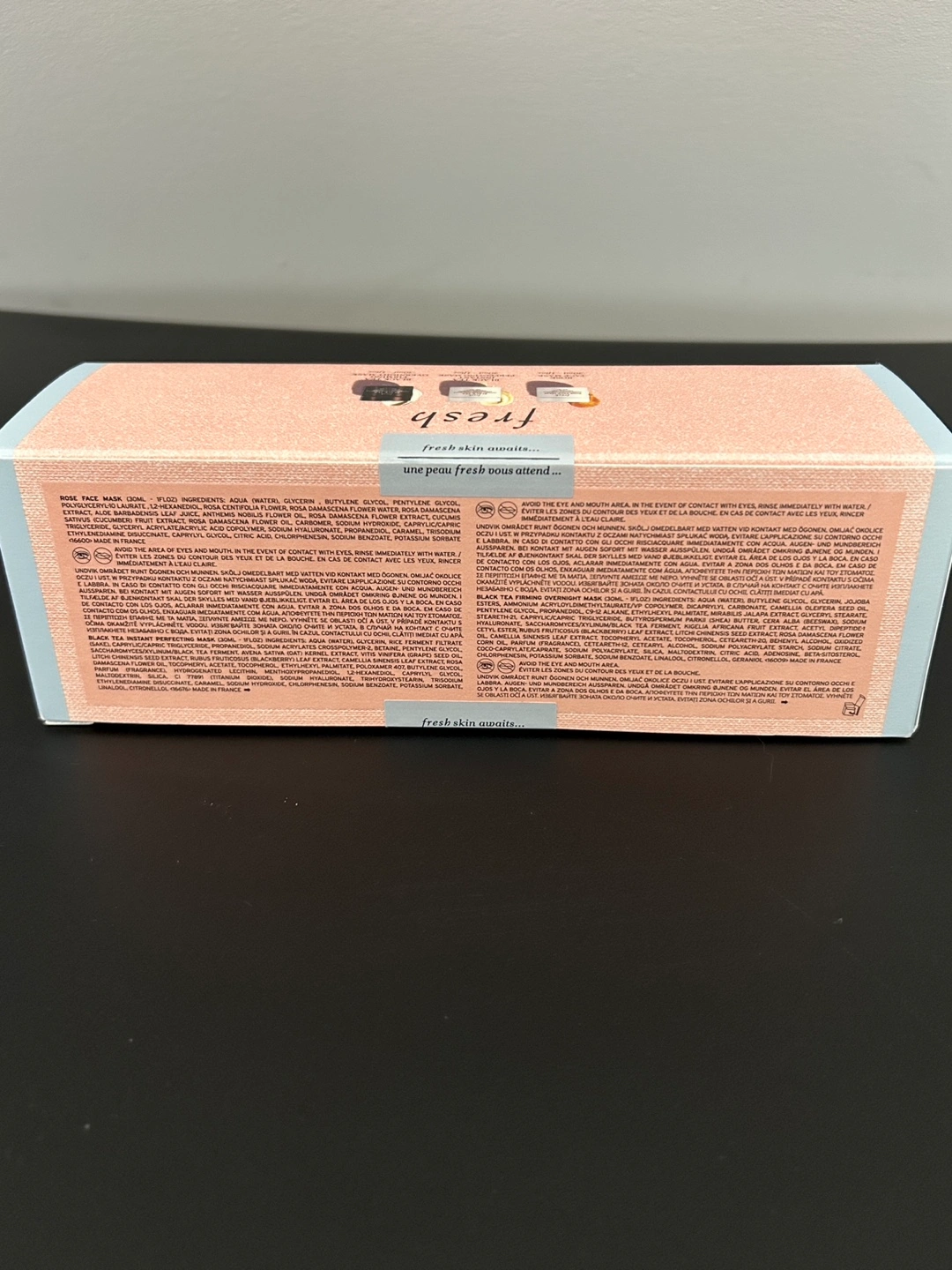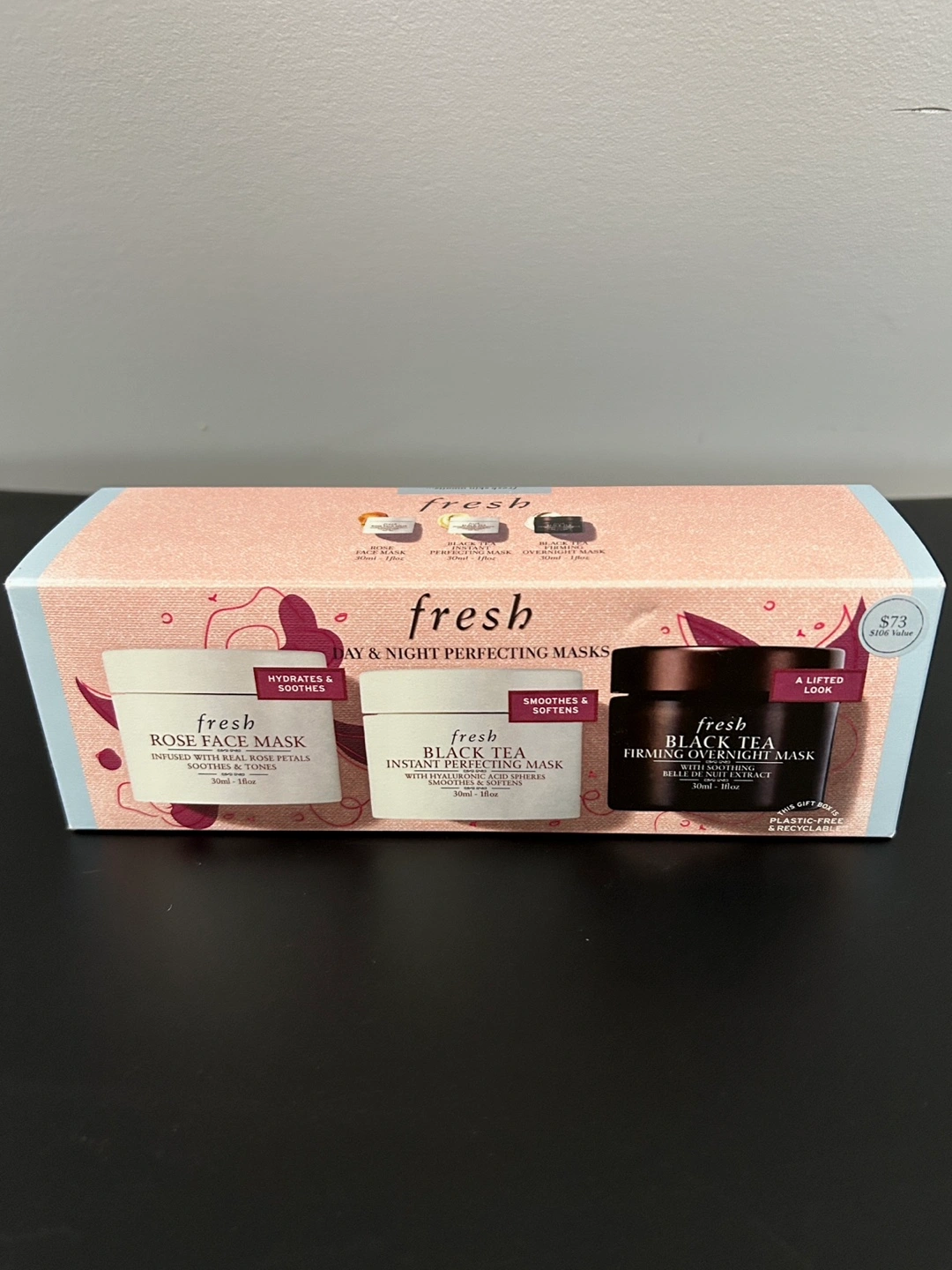 Fresh Day & Night Perfecting Masks gift set. Includes Rose Face Mask, Black Tea Instant Perfecting Mask,and Black Tea Firming Overnight Mask. $106 value. Brand new/unopened.
