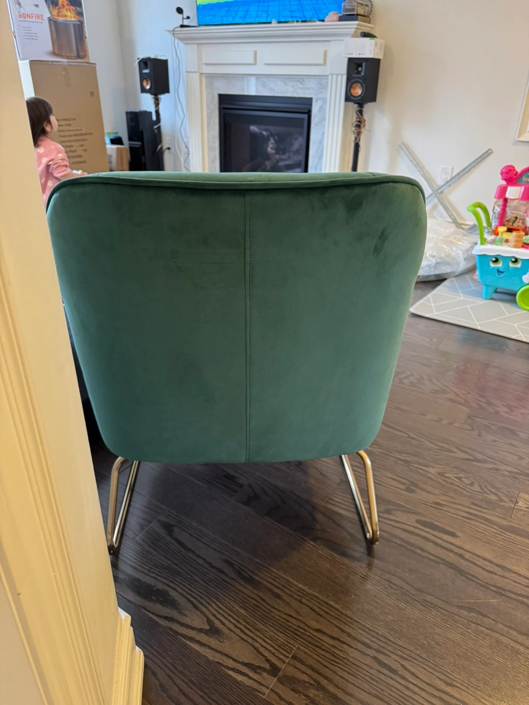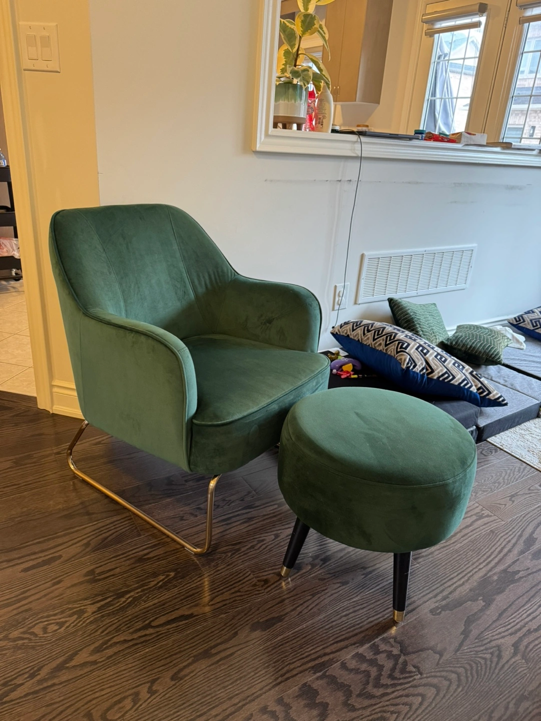 Gorgeous emerald green velvet armchair and ottoman set. In near perfect condition since it was an accent chair and never sat on. Smoke free pet free home.