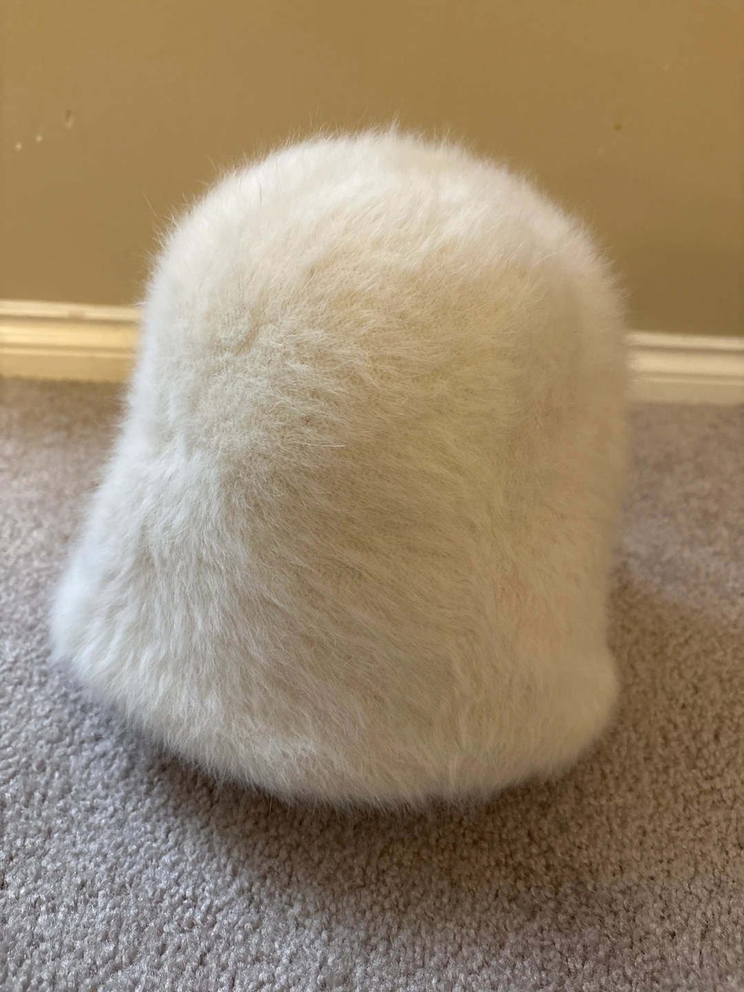 7Adorable off-white bucket hat. Soft, fuzzy material. Perfect for a cozy look.