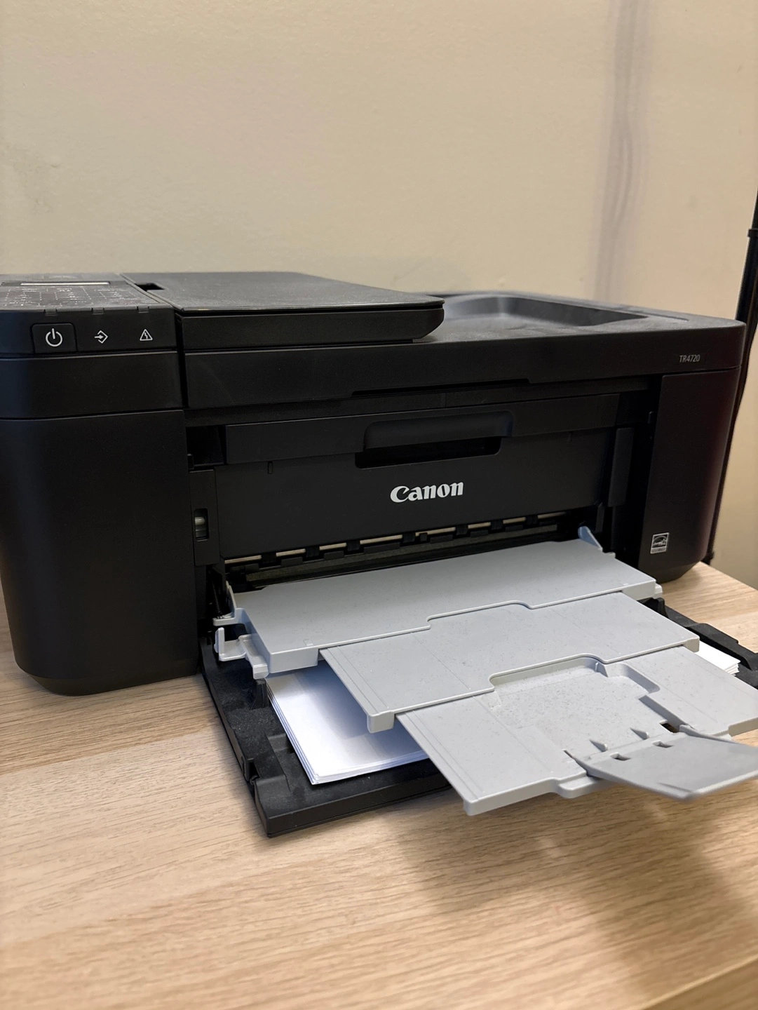 7Canon PIXMA TR4720 inkjet printer. All-in-one functions. Wireless capabilities. Includes paper tray. No ink cartridges. Include box. Used condition.