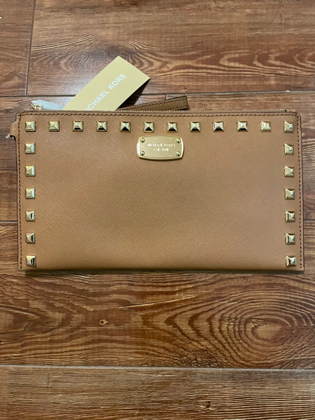 Brand new Michael Kors clutch wallet. Acorn coloured saffiano leather. Gold-toned studs. Features a zip closure and wristlet strap. Comes with tags and original packaging.