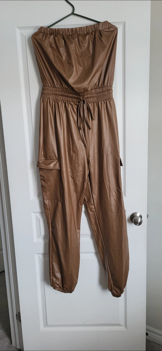 Brown faux leather jumpsuit. Strapless, side lace-up detail. Elastic waistband. Cargo pockets. Size XL. Excellent condition.