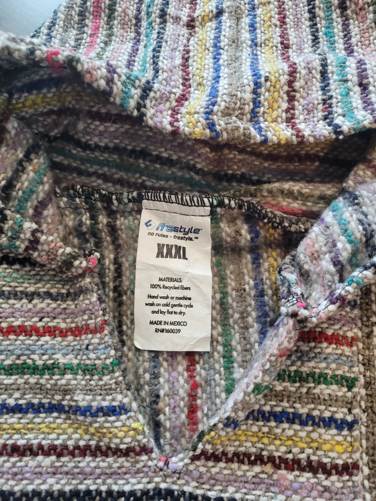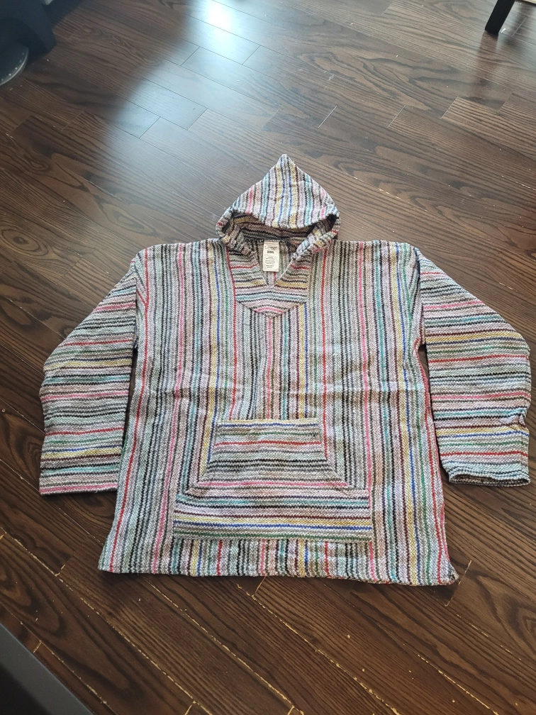 Multicoloured striped hemp hoodie. Size XXL. Hand wash or machine wash on cold gentle cycle. Made in Mexico.