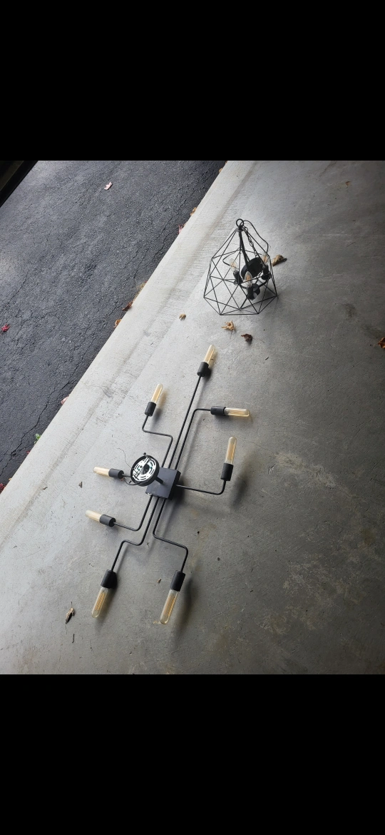 Five light fixtures for sale. Includes two chandeliers, a three-light vanity, a ring light, and a six-light fixture. Various styles available, modern and glamorous options. Excellent condition, ready for installation.i have about 6 different ones 45 each..ling blacked 50..