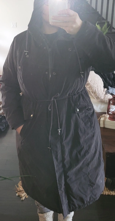 Women's long black parka. Features a hood, drawstring waist, and pockets. Zipper and snap closures. Warm and cozy. Size 1.