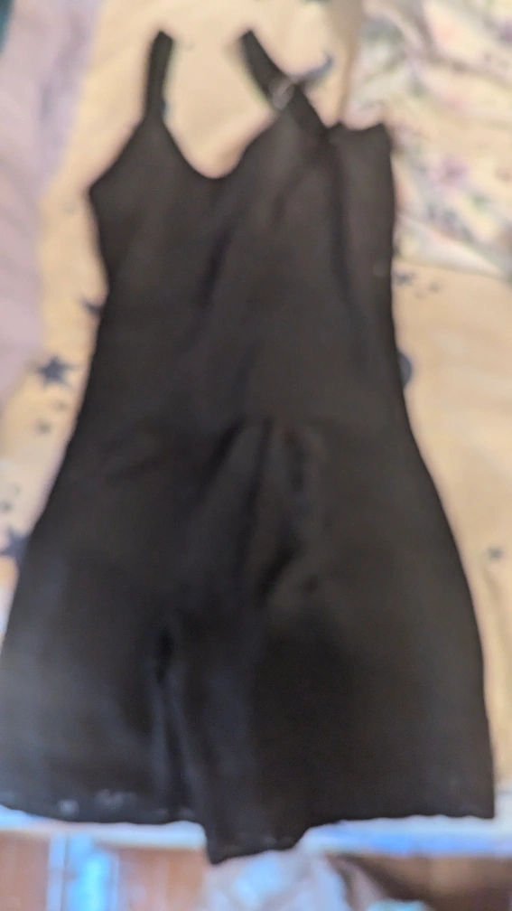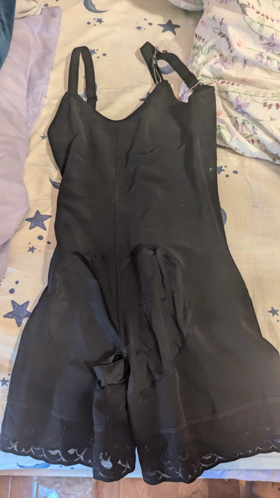 Women's body shaper, black colour. Features adjustable straps and a zipper closure. Lace trim at the bottom. xs size.