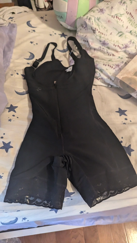 Women's body shaper, black colour. Features adjustable straps and a zipper closure. Lace trim at the bottom. xs size.