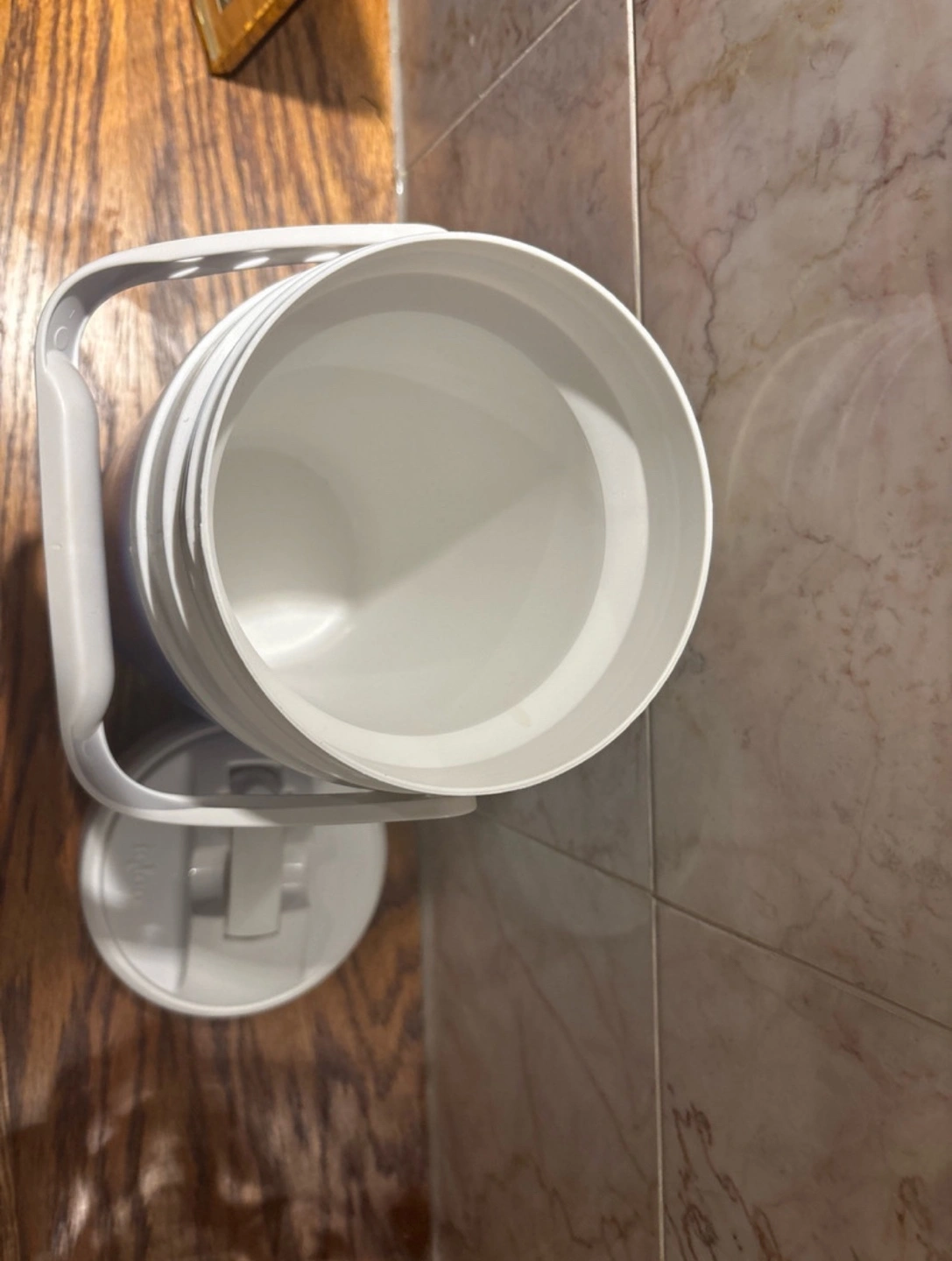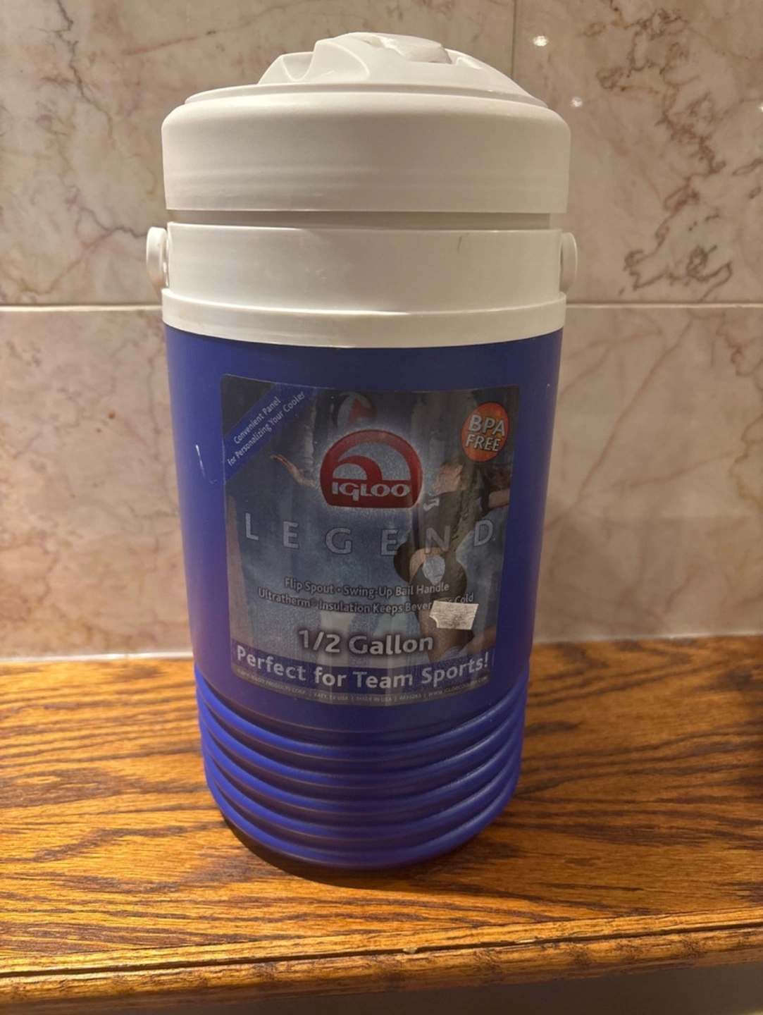 Blue and white plastic water jug. Flip-top spout and handle. Ultra-therm insulation keeps beverages cold. BPA free. Perfect for team sports. Hold up to half a gallon