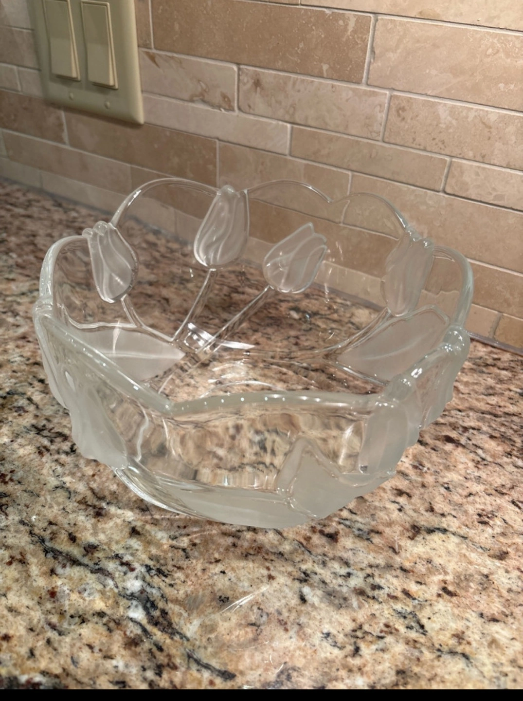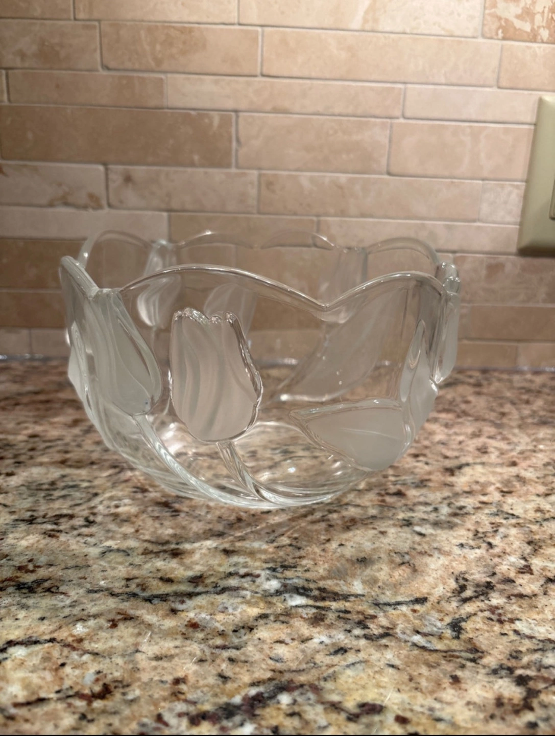 Beautiful glass bowl. Features a frosted tulip design. Perfect for serving snacks or as a decorative piece. Mikasa Nadine 5" Round Clear Frosted Tulip Bowl Made In West Germany