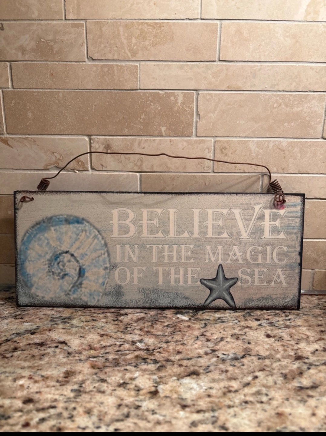 Rustic wooden wall sign. Features seashell and starfish design. Says Believe in the Magic of the Sea. Comes with wire hanger.