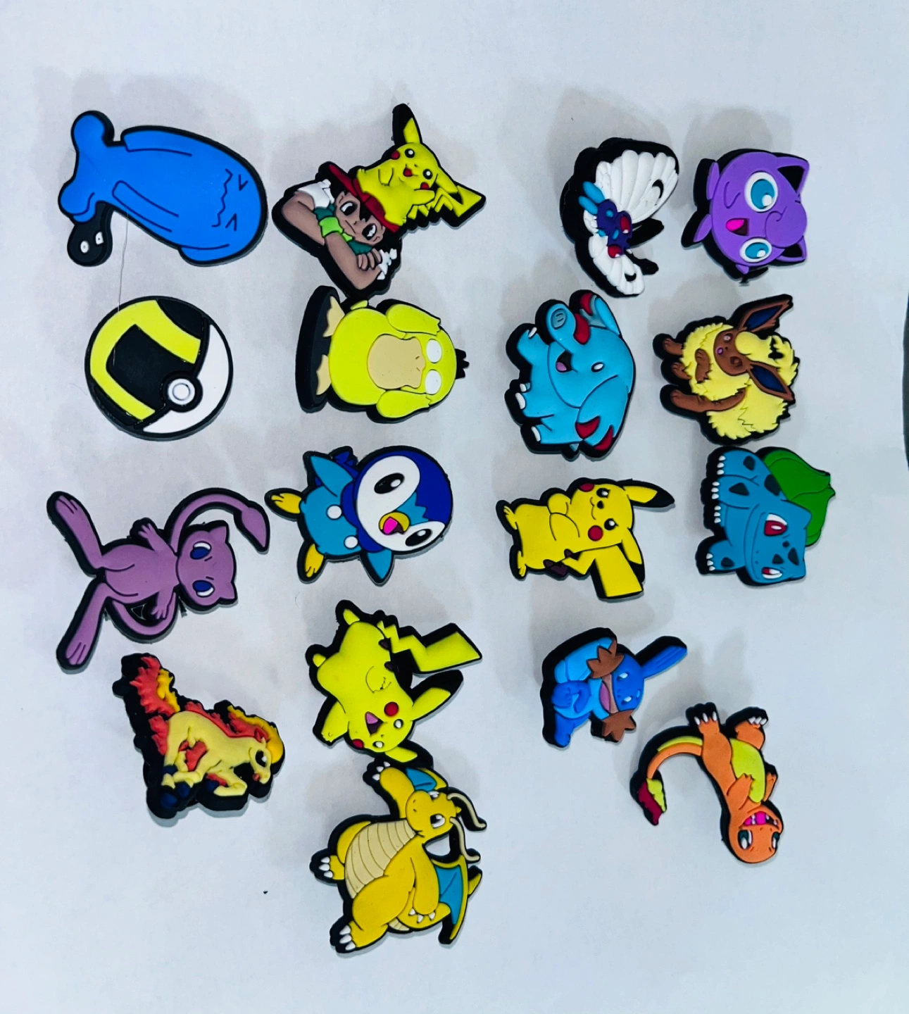 Set of 16 Pokemon shoe charms. Includes popular characters like Pikachu, Charmander, and Bulbasaur. Great for Crocs or other shoes. Fun and collectible.