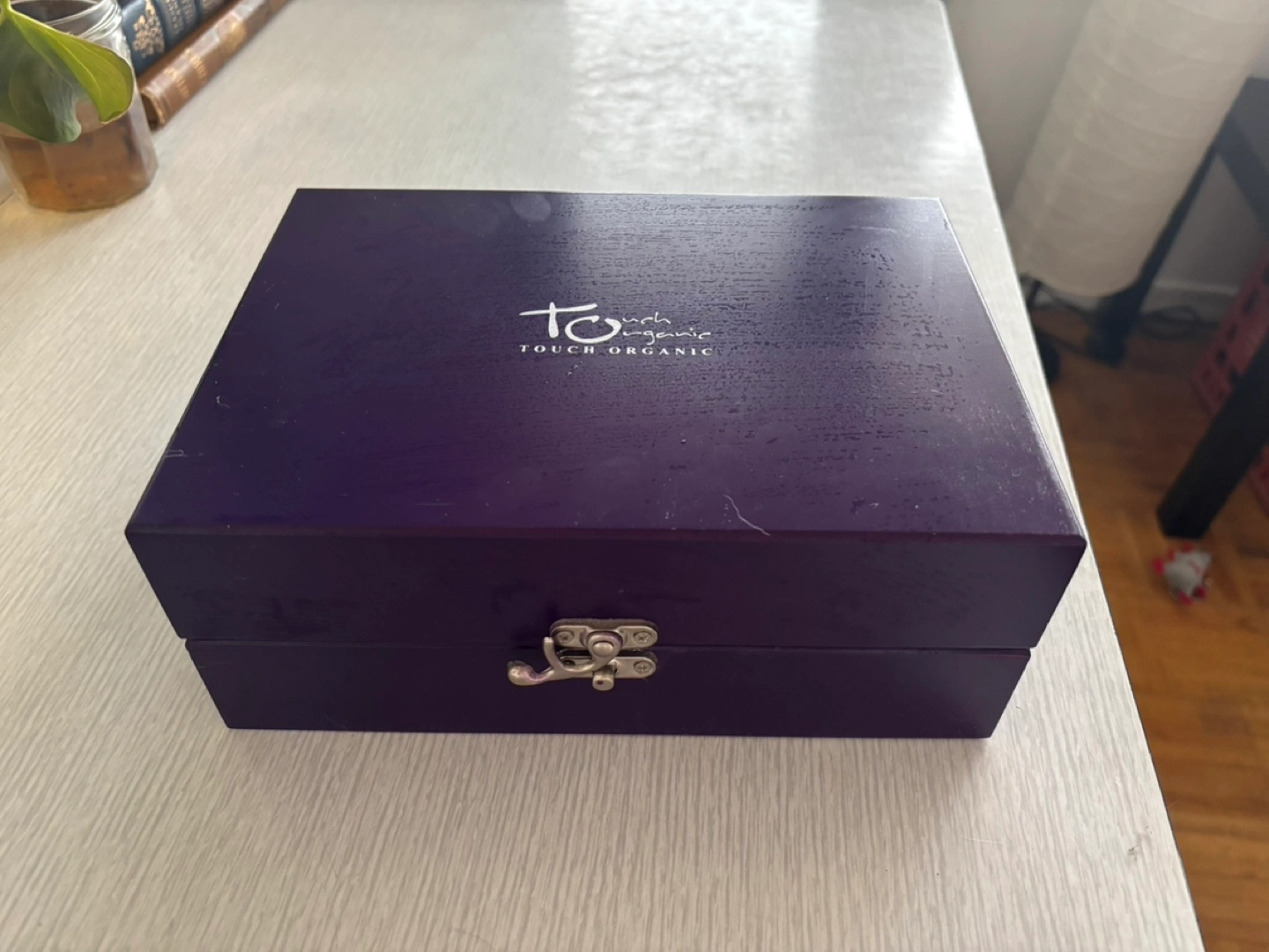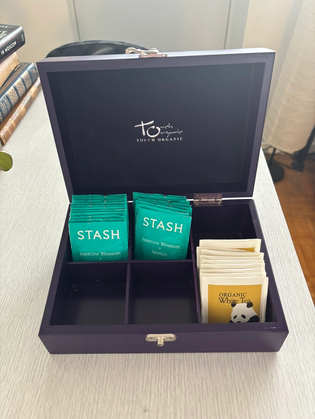 248Purple wooden tea box. Contains compartments. Includes Stash Jasmine Blossom tea and Organic White Tea. Great for organizing tea bags.