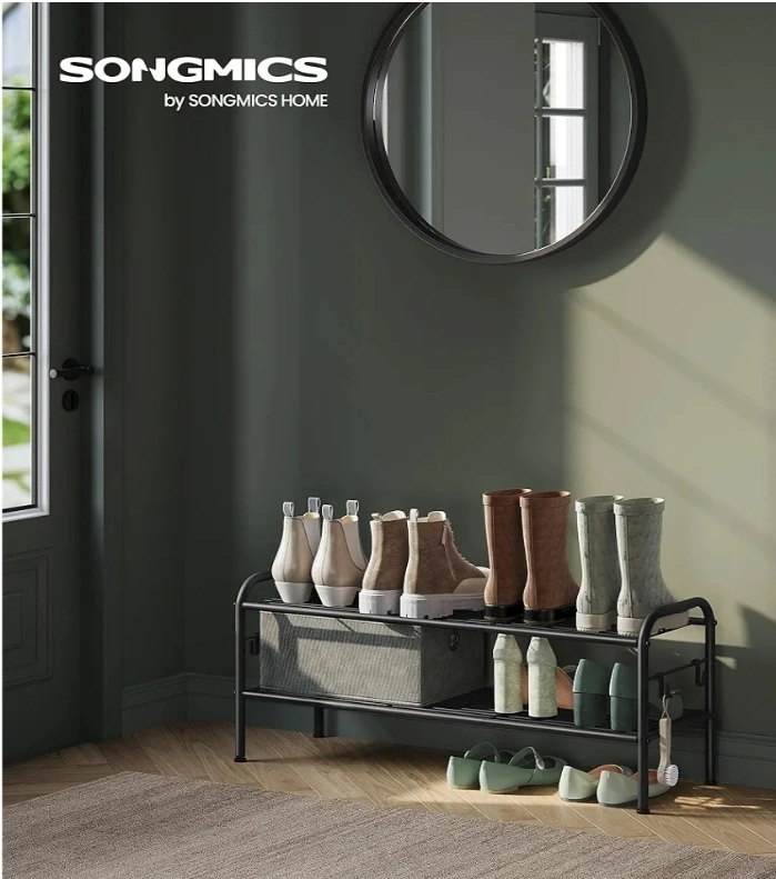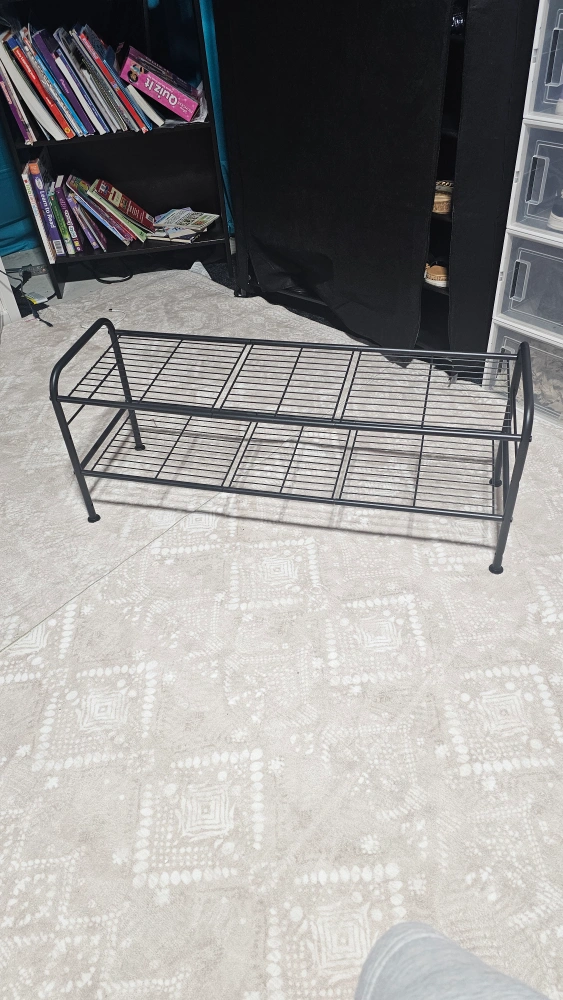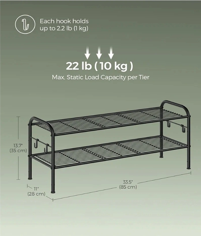 Two-tier metal shoe rack. Durable steel construction. Holds up to 10 pairs of shoes. Great for entryway, hallway, or closet.