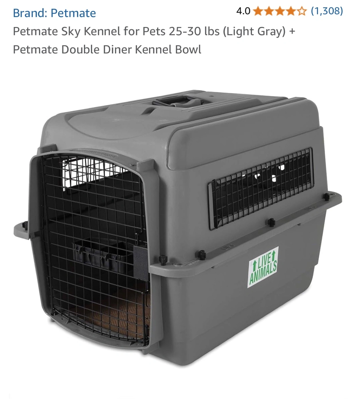 Pet carrier- Petmate Sky Kennel, light gray colour. Suitable for pets weighing 25-30 lbs. Includes double diner kennel bowl. Travel kit. Airline approved.