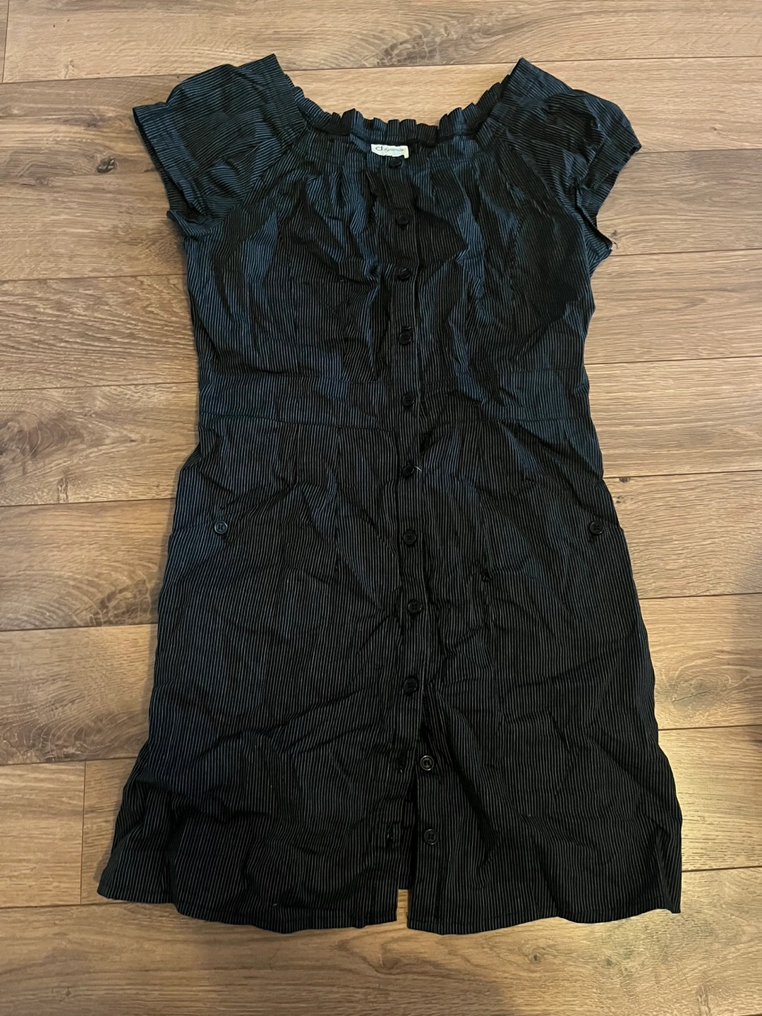 Short-sleeved, button-down dress. Dark blue with thin white stripes. Fabric is lightweight, comfortable. Can be dressed as a long dress shirt or a short dress. Very cute! Size is small but I would say fits more like xsmall. Brand is Dynamite