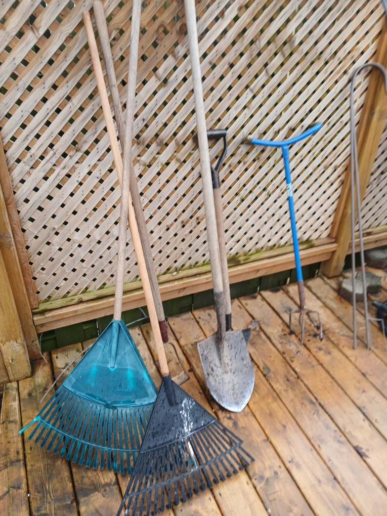 Collection of outdoor tools includes shovels, rakes, and a garden cultivator. Wooden and plastic handles. Some show wear from use. $5 each