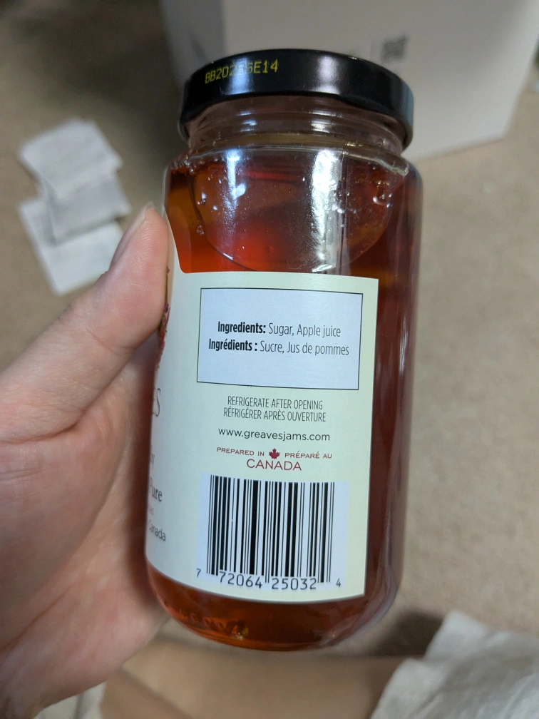 Sealed jar of Greaves pure apple jelly. 250ml. Made in Canada.