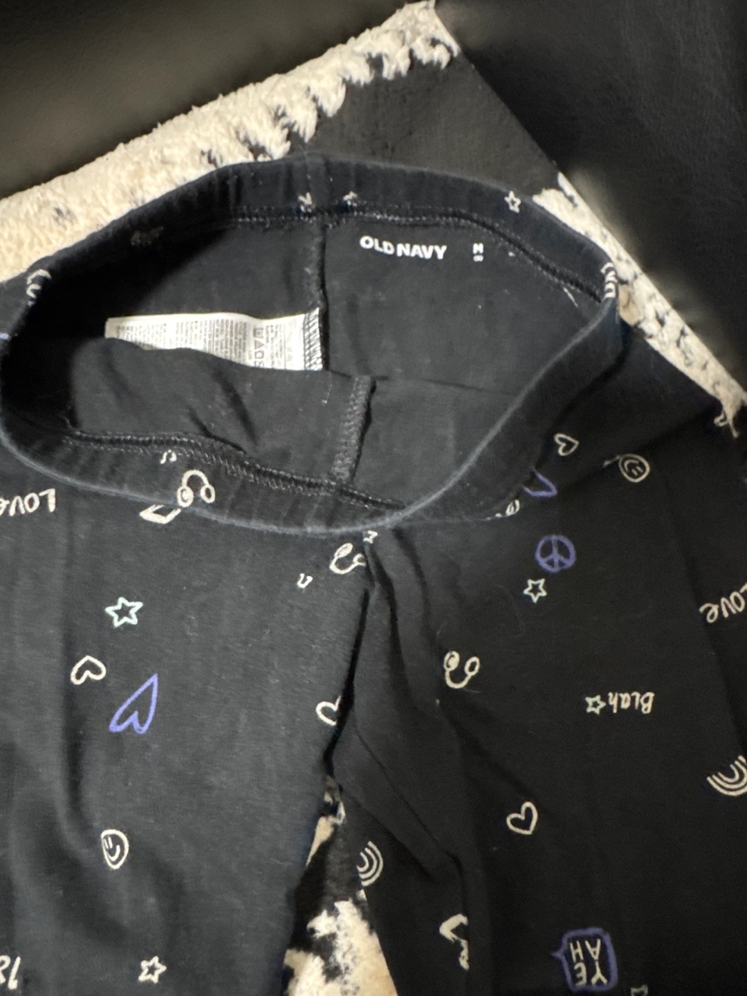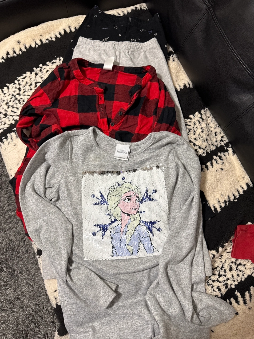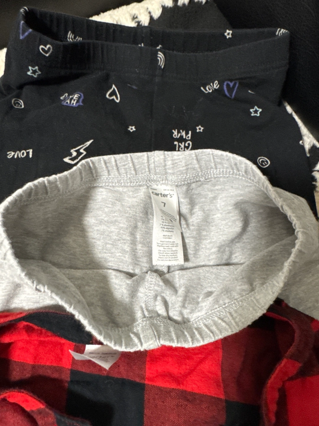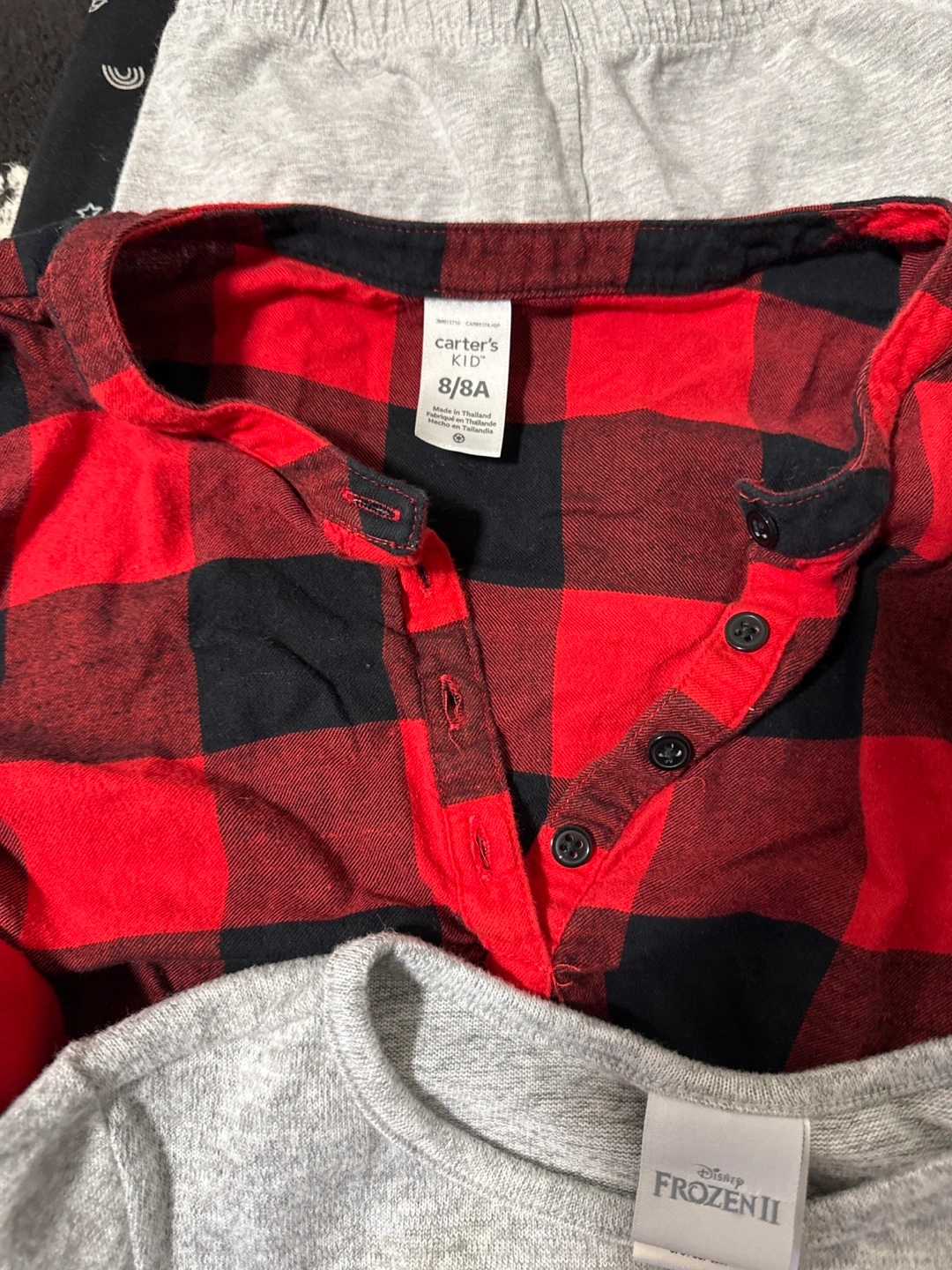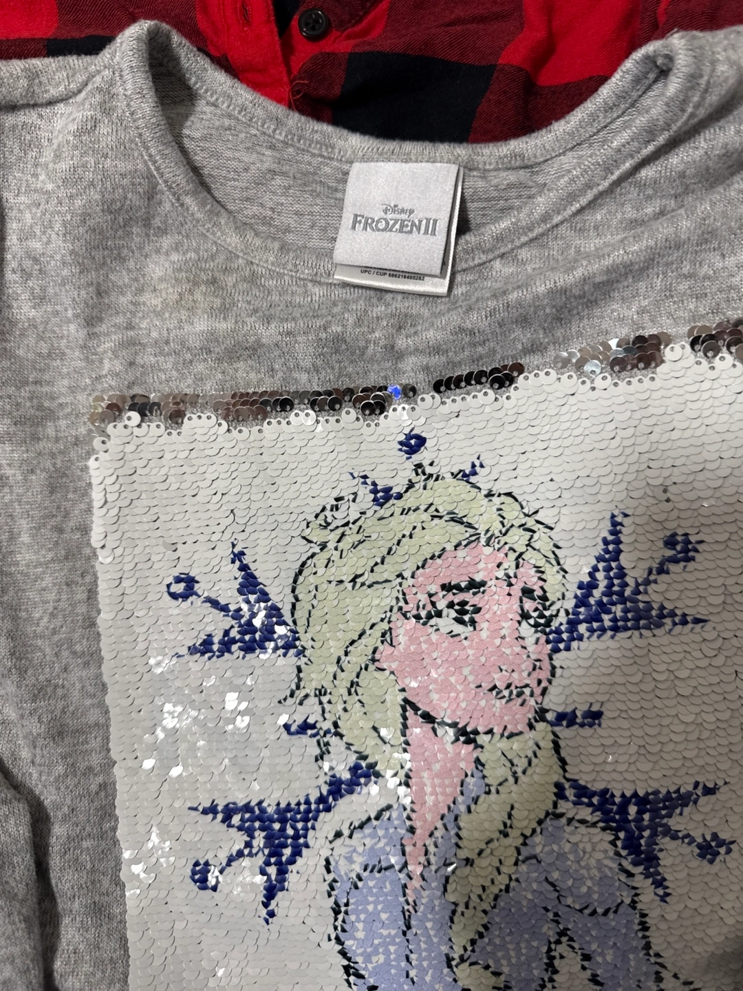 Bundle includes four items: Carter's grey leggings size 7, red and black buffalo plaid flannel shirt size 8, Black old navy leggings and grey long sleeve Frozen II sequin top. All in good used condition. Perfect for fall and winter.