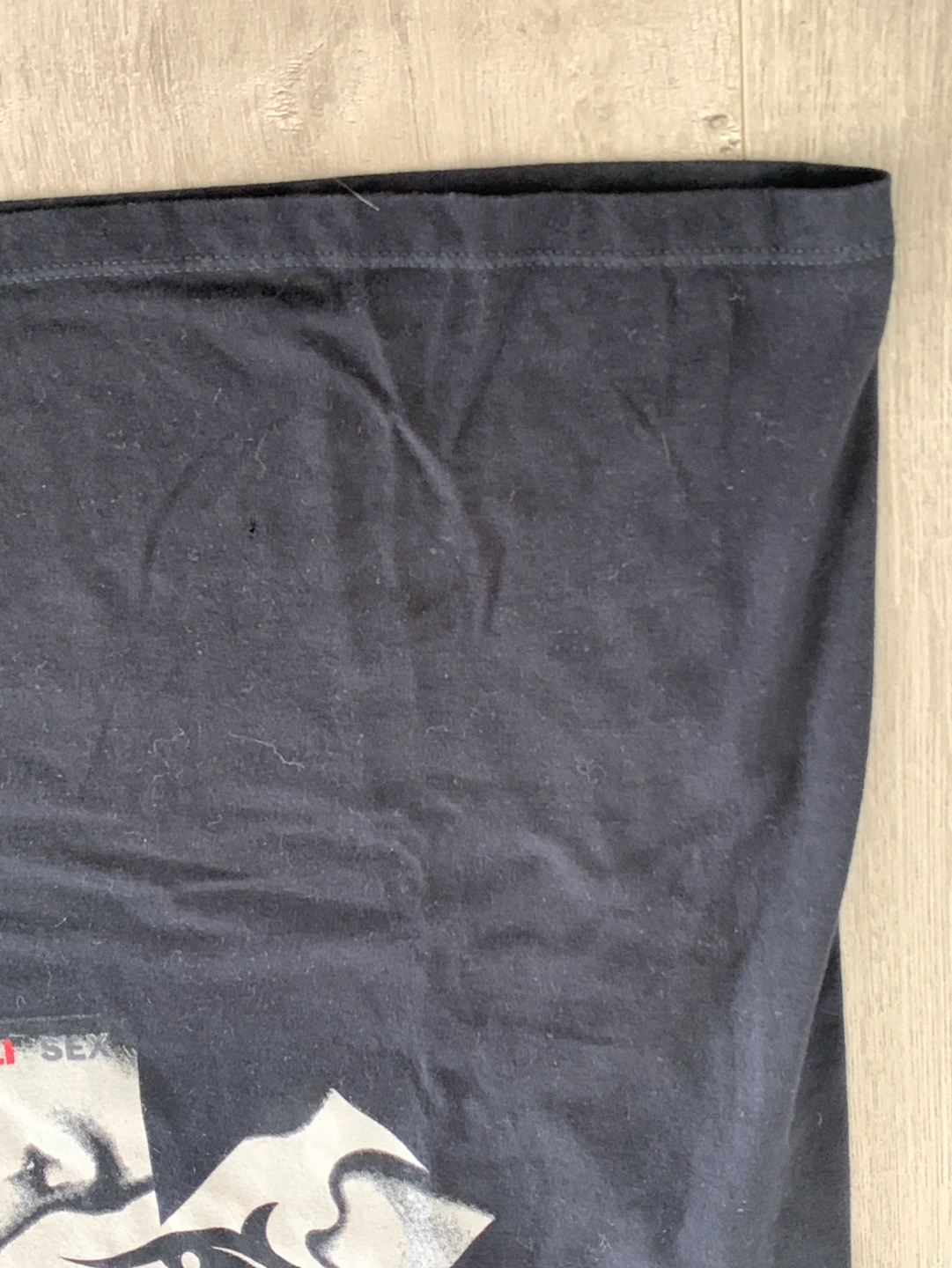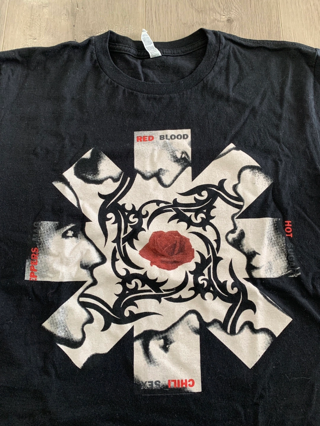 Black short sleeve band tee. Features the Red Hot Chili Peppers logo and album art for Blood Sugar Sex Magik .