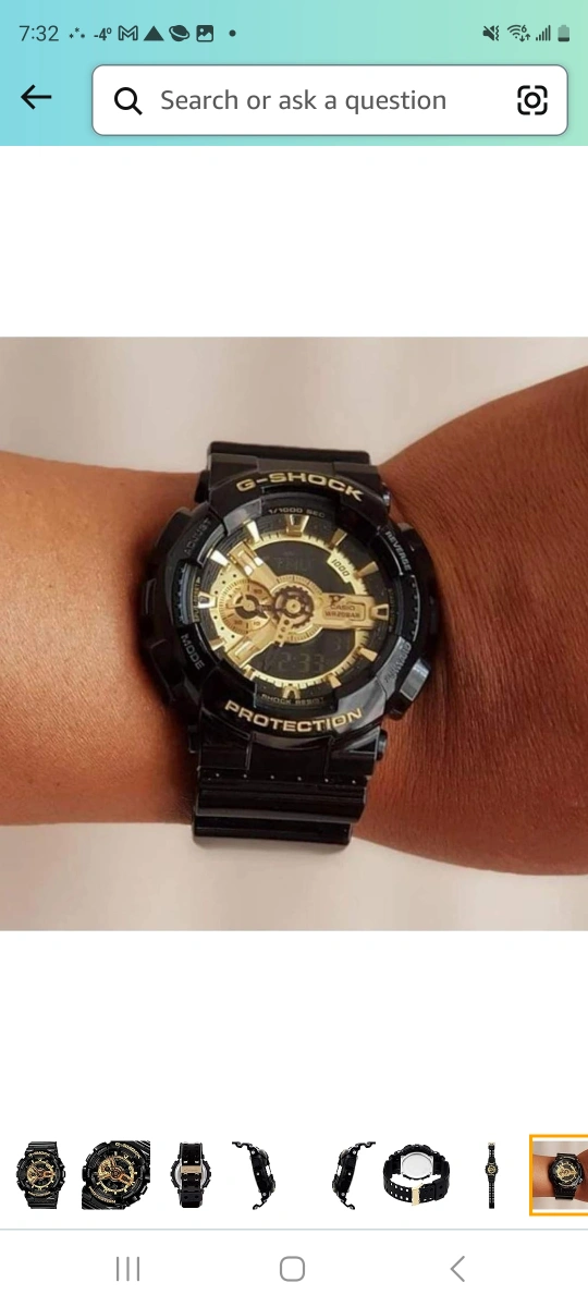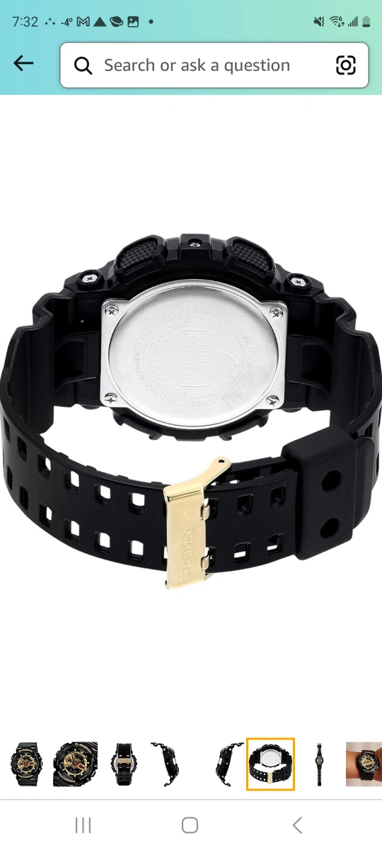 Stylish G-Shock watch. Black resin band and case. Gold accents. Multiple functions. Shock resistant. Water resistant.