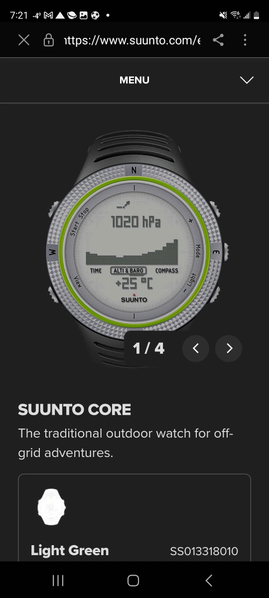 Pre-owned Suunto Core watch. Light green colour. Features altimeter, barometer, and compass. Durable construction. Ideal for outdoor adventures.