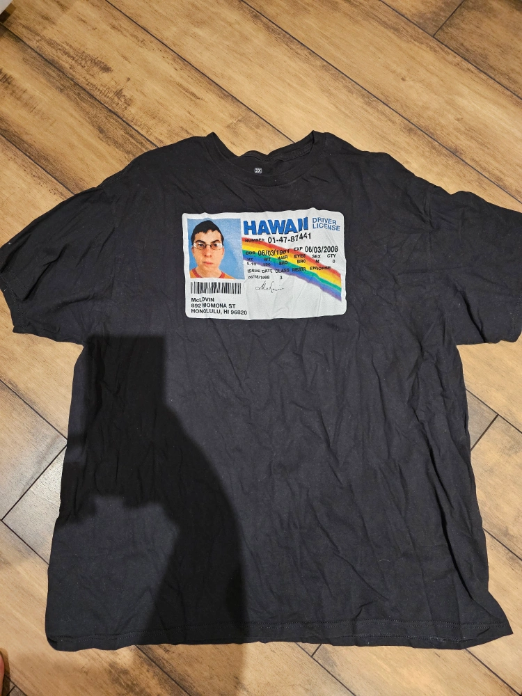 Black T-shirt featuring a graphic of McLovin's Hawaiian driver's license. Men's large. Cash Only