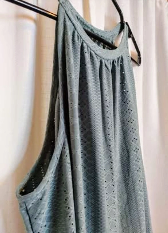 Casual pleated pointelle style, flowy camisole look, with a halter neckline and eyelet detailing. Lightweight and breathable fabric.