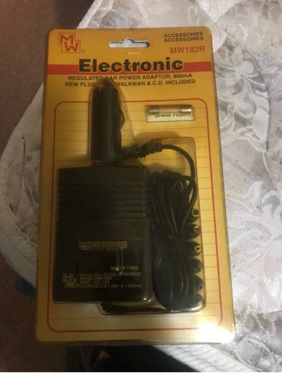 Regulated car power adaptor. 800mA. New plugs for Walkman and CD included. Spare fuse. Model MW182R.