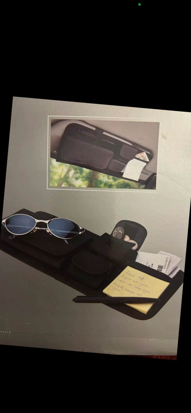 Black visor organizer. Multiple compartments for sunglasses, phone, cards, and other small items. Attaches to your car's sun visor. New in box.