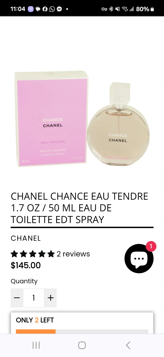 50 ml / 1.7 oz bottle of Chanel Chance Eau Tendre Eau De Toilette. EDT spray. Only sprayed twice to test.
