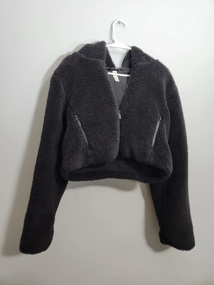 Cozy cropped sherpa hoodie jacket. Black colour. Zip closure. Soft and warm material! size M, I usually wear XS or S but it still looks cute with size M.