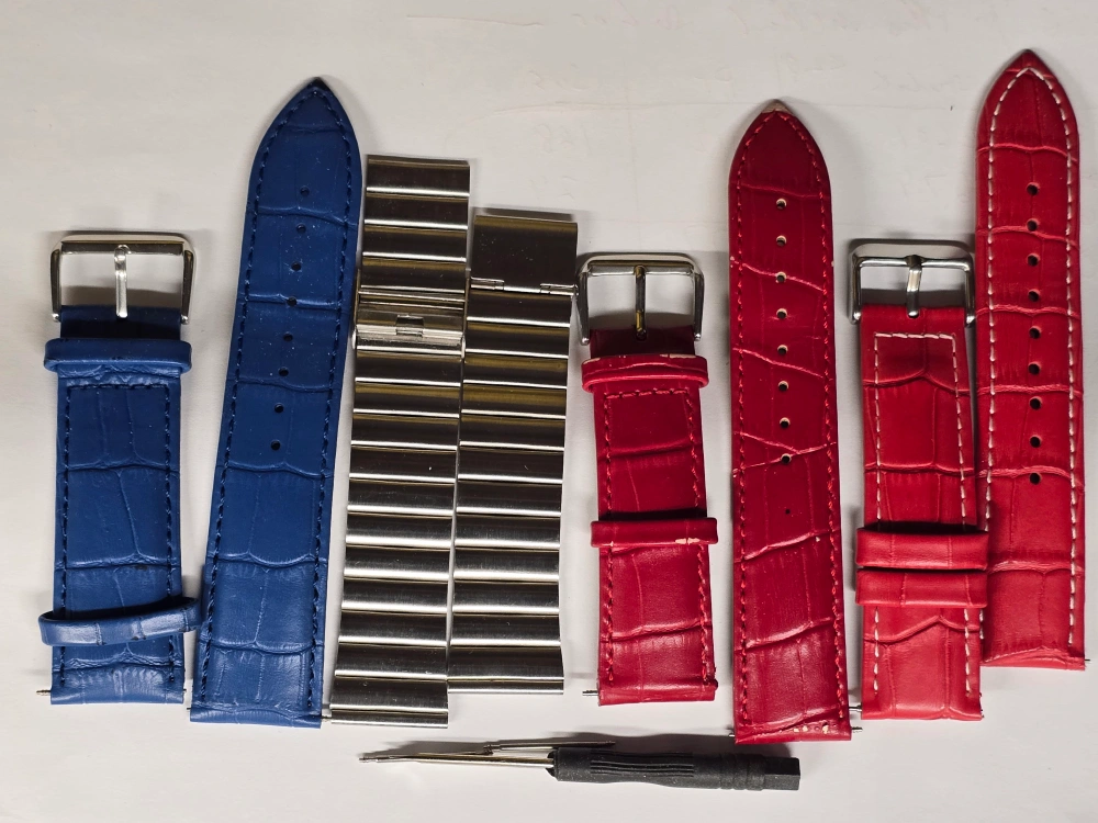 four pairs watch bands: blue leather, two red leather, and one stainless steel. Includes spring bars and watch band tool. Great for watch repair or replacement.