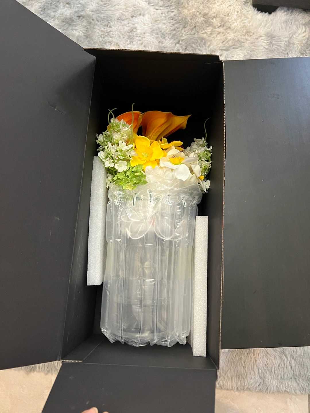 Beautiful artificial flower arrangement. Features orange calla lilies, yellow and white flowers. Arranged in a clear crystal vase with a pedestal base. New, never displayed. Packaged carefully in a black box.