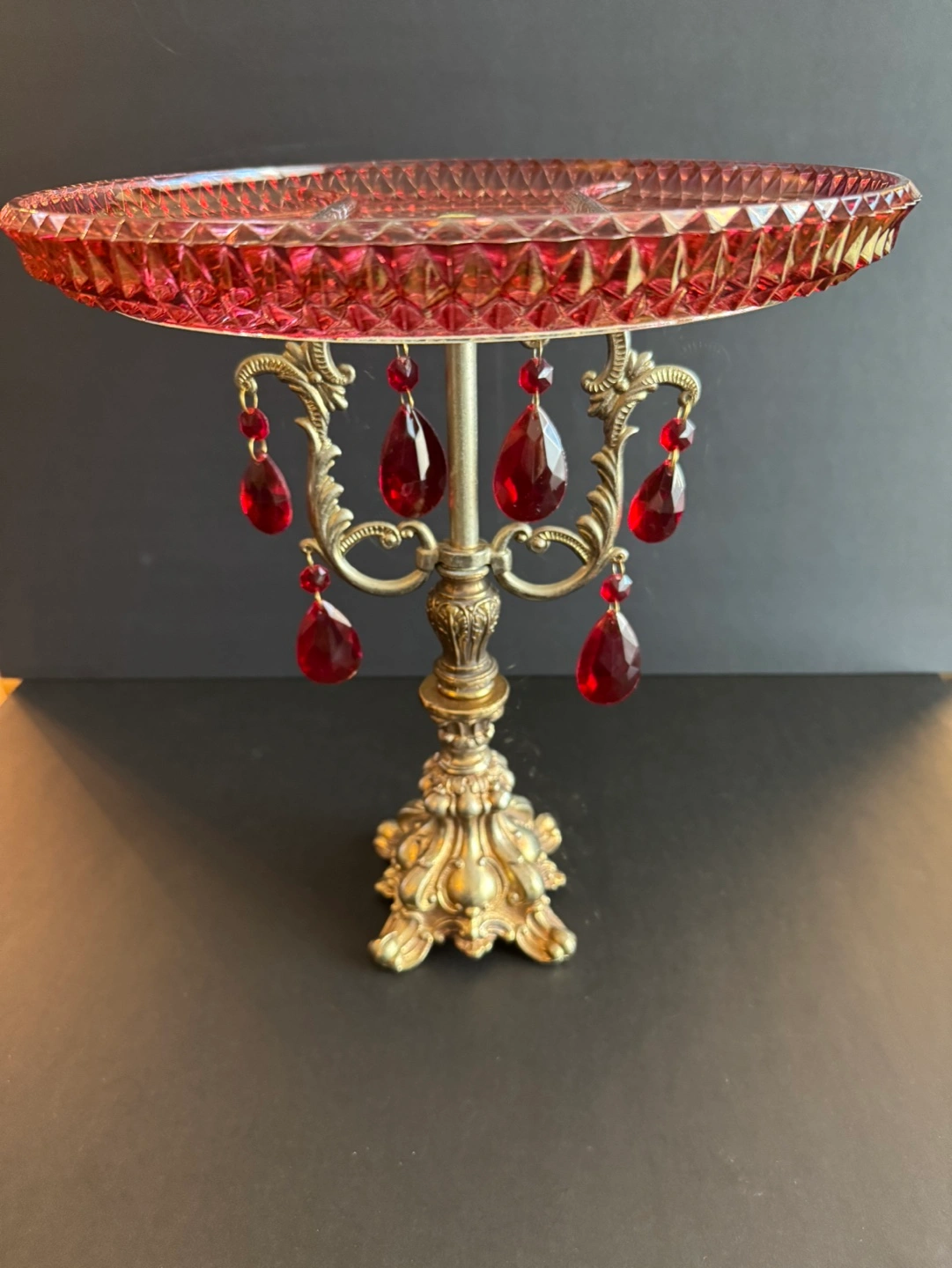 Ornate cake stand. Features a red glass top and brass base with decorative accents. Perfect for displaying desserts or other small items. Unique and eye-catching.High 14 inches,diameter 12 inches