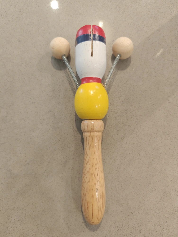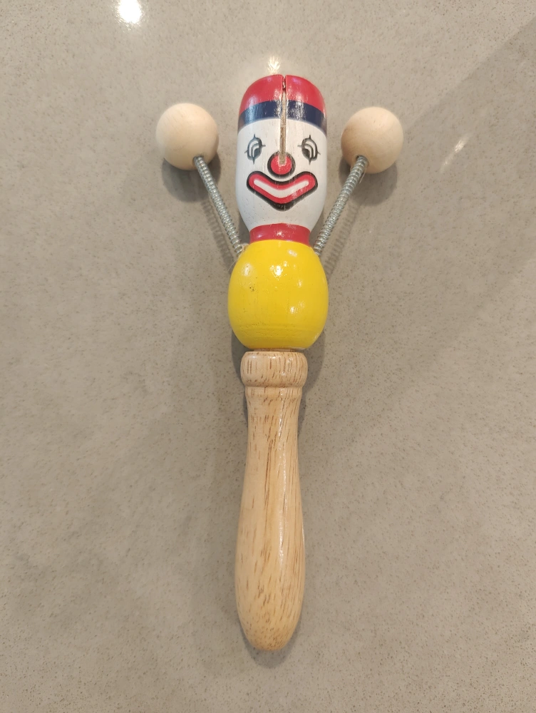 Adorable vintage wooden rattle toy. Features a painted clown face and colourful accents. Great for babies or collectors. Plays a gentle rattling sound when shaken.